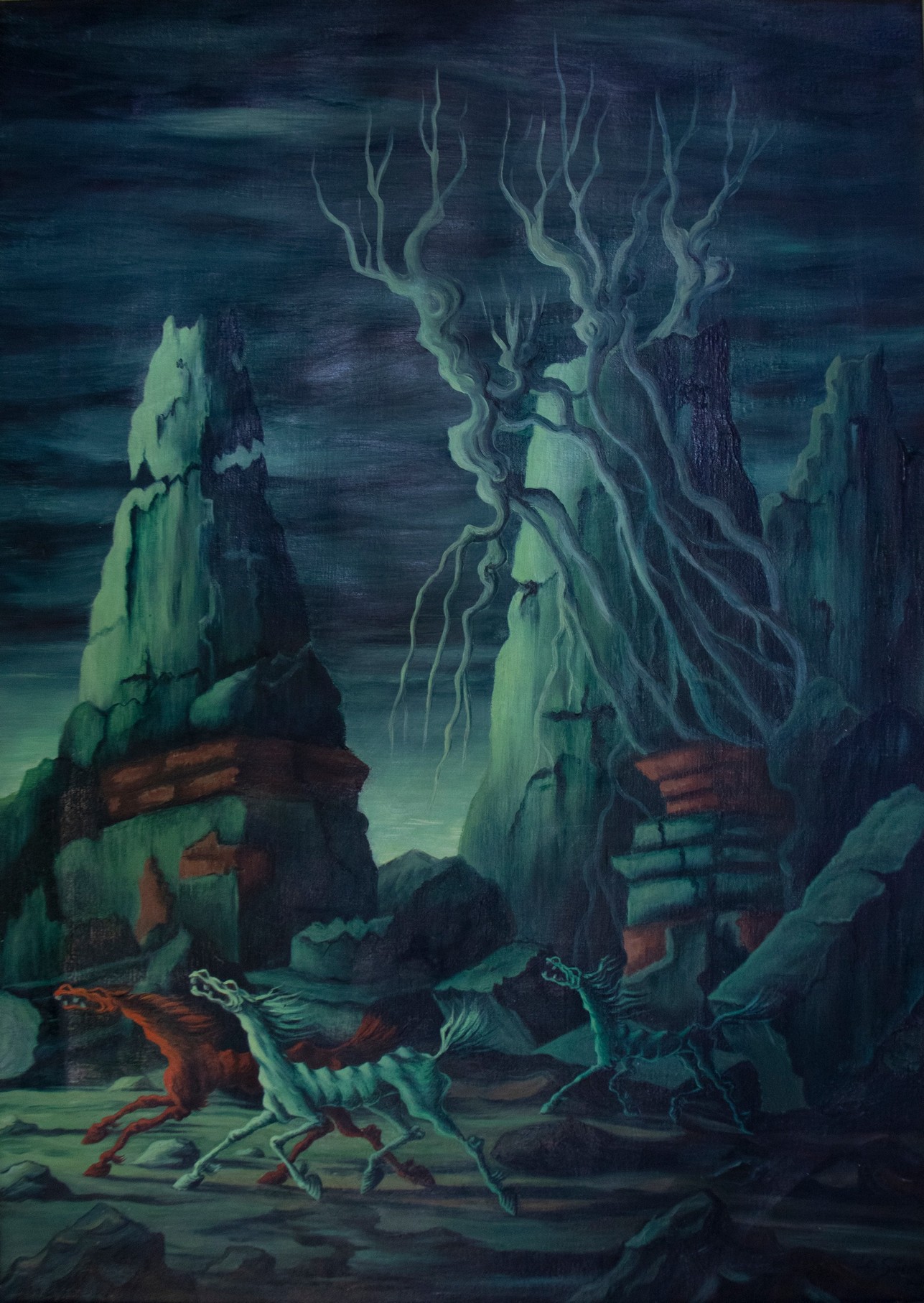 | dc.description | La obra consiste en un grupo de caballos corriendo en un lugar en ruinas, se emplean tonalidades azules y rojizas. | |
