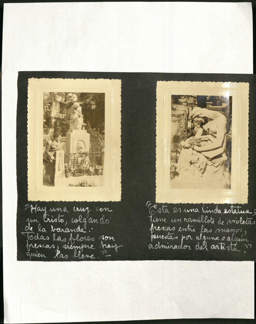 "Esta es una linda estatua; tiene un ramillete de violetas frescas entre las manos puestas por alguna o algún admirador del artista"