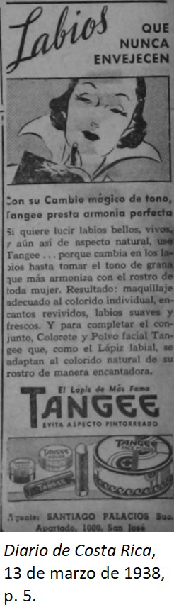 | dc.description | El anuncio muestra en la parte superior el rostro de frente de una mujer, bien arreglado y con su labios pintados resaltados. Debajo de este aparece un texto explicativo que destaca las cualidades del labial Tangee, mientras que en la parte inferior se muestra el nombre de la marca en letras negras y debajo unas imágenes de cosméticos Tangee. | |