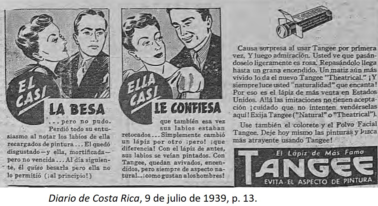 | dc.description | El anuncio muestra en su parte superior un dos imágenes, de una mujer observando a un hombre y otra de un hombre y una mujer observarse, con un texto debajo acerca de maquillaje de labiales. En la parte derecha del anuncio se presenta un texto texto explicativo acerca de las propiedades del labial Tangee. | |