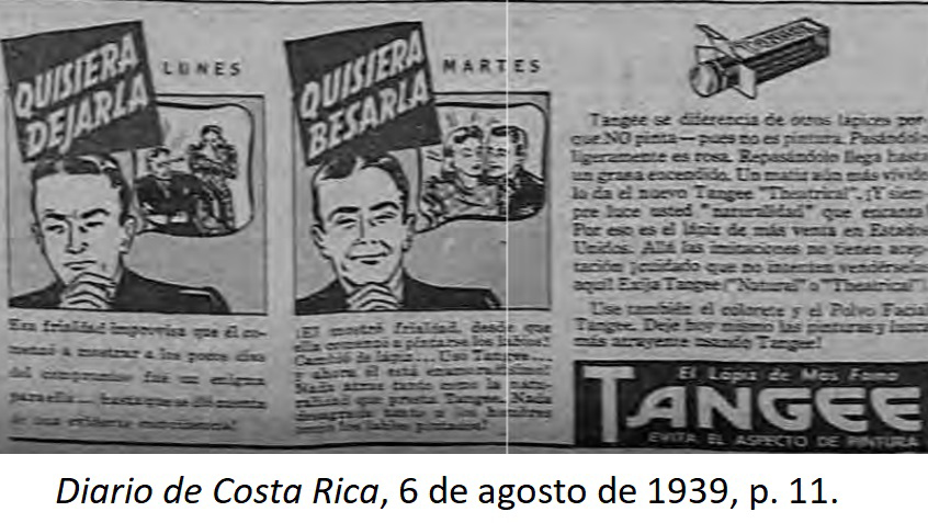 | dc.description | El anuncio muestra en su parte superior un dos imágenes, una de un hombre que piensa en una discusión con su pareja y la otra del hombre pensando en una escena romántica con su pareja, con un texto debajo acerca de maquillaje de labiales. En la parte derecha del anuncio se presenta un texto texto explicativo acerca de las propiedades del labial Tangee. | |
