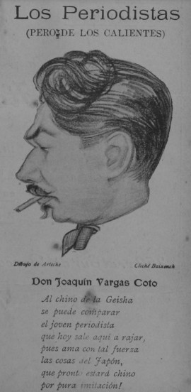 | dc.description | Rostro de un hombre adulto de perfil, su cabello es medianamente largo, tiene bigote, nariz perfilada, cejas fruncidas y fuma un cigarro. Su expresión facial es seria. Se trata de Don Joaquín Vargas Coto. | |