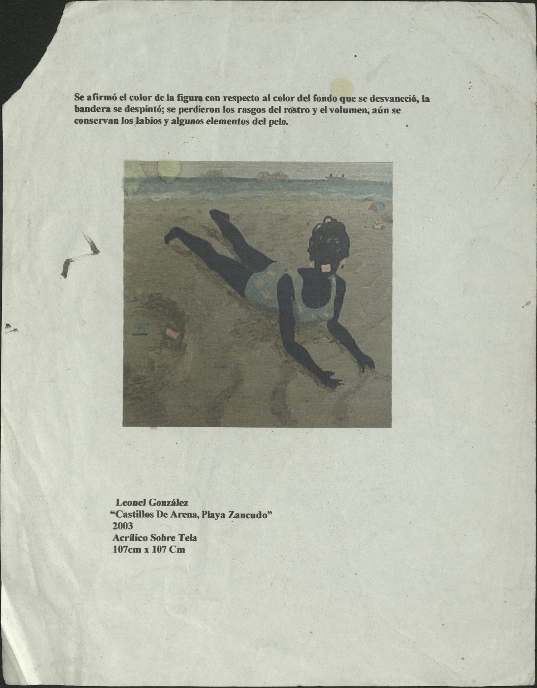 | dc.description | Papel levemente manchado, doblado y rasgado. Texto: Se afirmó el color de la figura con respecto al color del fondo que se desvaneció, la bandera se despintó; se perdieron los rasgos del rostro y el volumen, aún se conservan los labios y algunos elementos del pelo | |