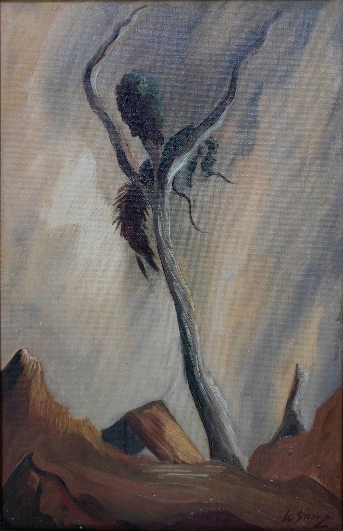| dc.description | La obra consiste en una rama de árbol en medio de tierra desértica, se empelan colores cafés y negros. | |