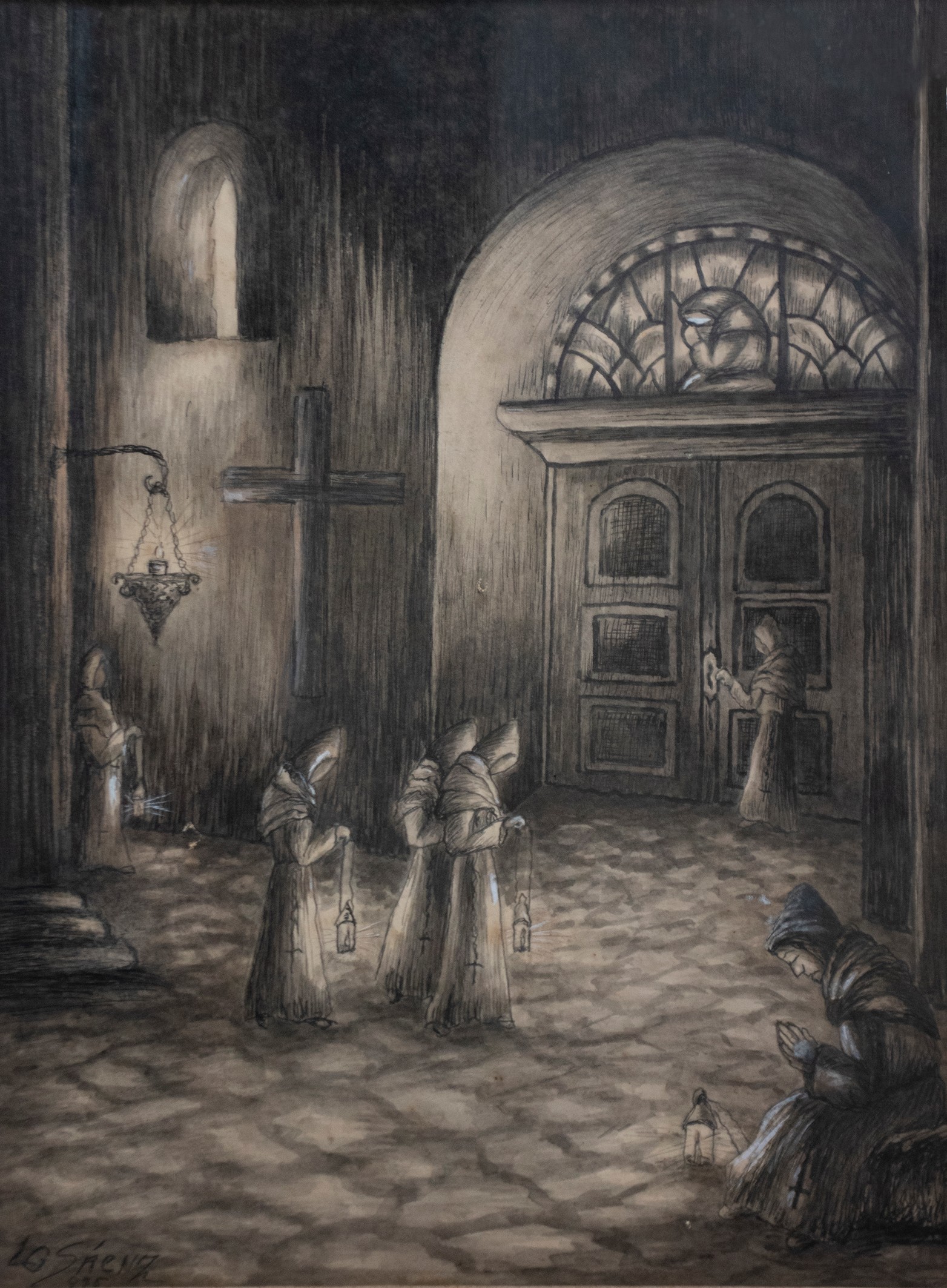 | dc.description | La obra consiste en una calle de una ciudad, con diversas personas con linternas y frente a una gran puerta | |