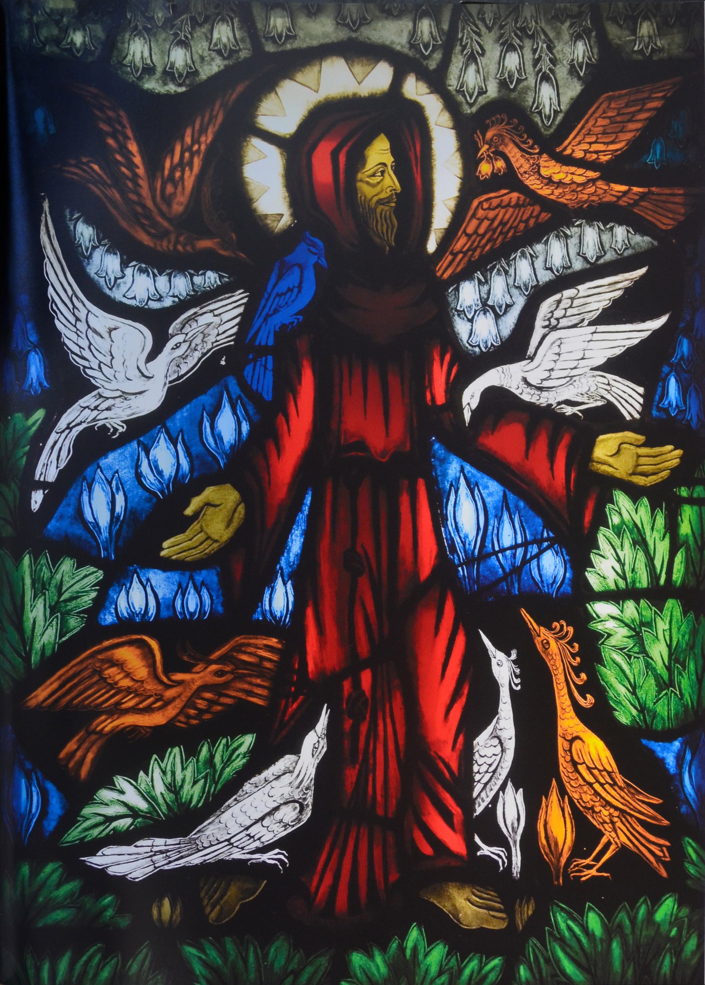 | dc.description | La obra consiste en un vitral con la figura de un hombre en el centro, rodeado de diversas aves. | |