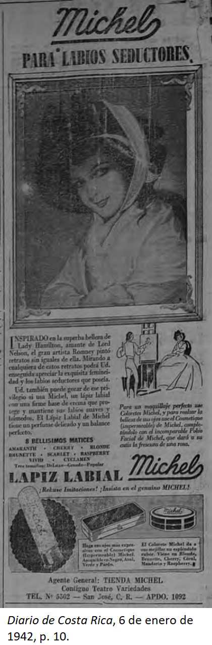 | dc.description | El anuncio muestra en la parte superior el título del anuncio, seguido del rostro de frente de una mujer, bien arreglado y con su labios pintados resaltados. Debajo de este aparece un texto explicativo que destaca las cualidades del labial Michel y en la parte derecha una imagen de una mujer que está siendo retratada en una pintura. Al final unas los dibujos de varios cosméticos de la marca Michel. | |