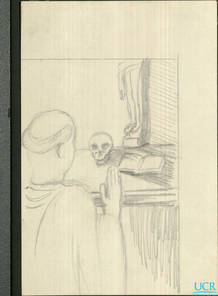 Agenda de color roja que pertenecía a la artista Luisa González Feo, en ella se encuentran diversos bocetos y grabados realizados por la artista.