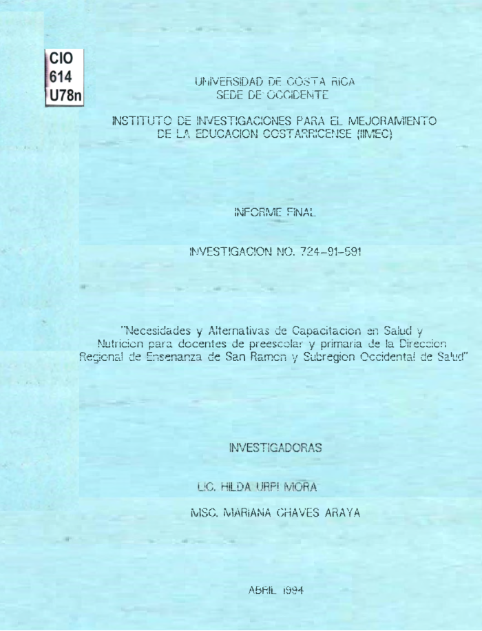 A la cabeza de la portada: Universidad de Costa Rica. Sede de Occidente. Instituto de Investigaciones para el Mejoramiento de la Educación Costarricense. Informe final. Investigación No. 724-91-591.