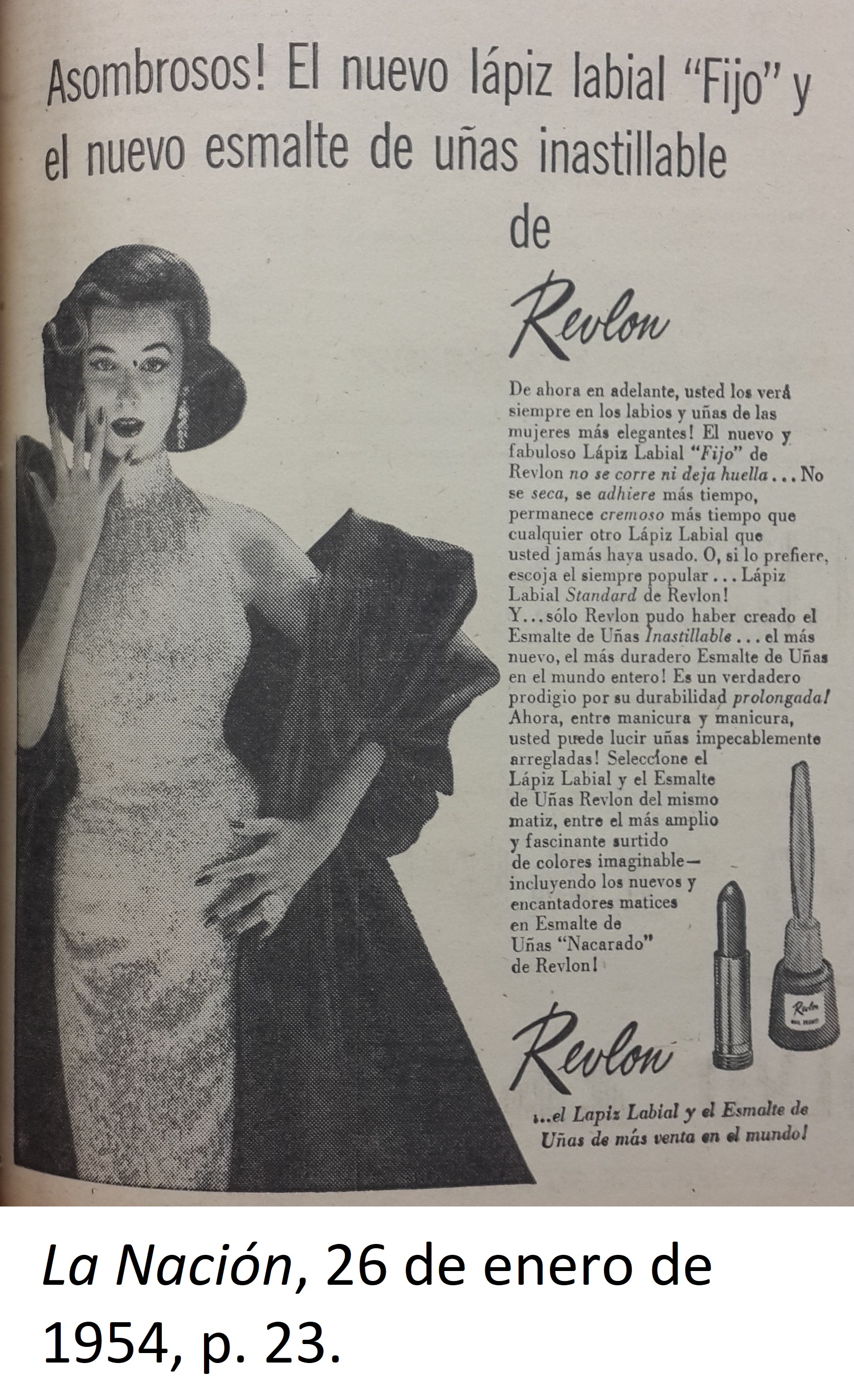 | dc.description | El anuncio muestra una imagen de una mujer y del labial de la marca Revlon. Además, se muestra un texto explicativo que destaca las cualidades del labial Revlon y la marca del labial en letras grandes. | |