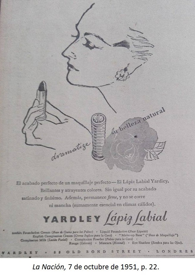 | dc.description | El anuncio muestra una imagen del rostro de una mujer pintándose los labios. Además, se muestra un texto explicativo que destaca las cualidades del labial Yardley y la marca del labial en letras grandes. | |