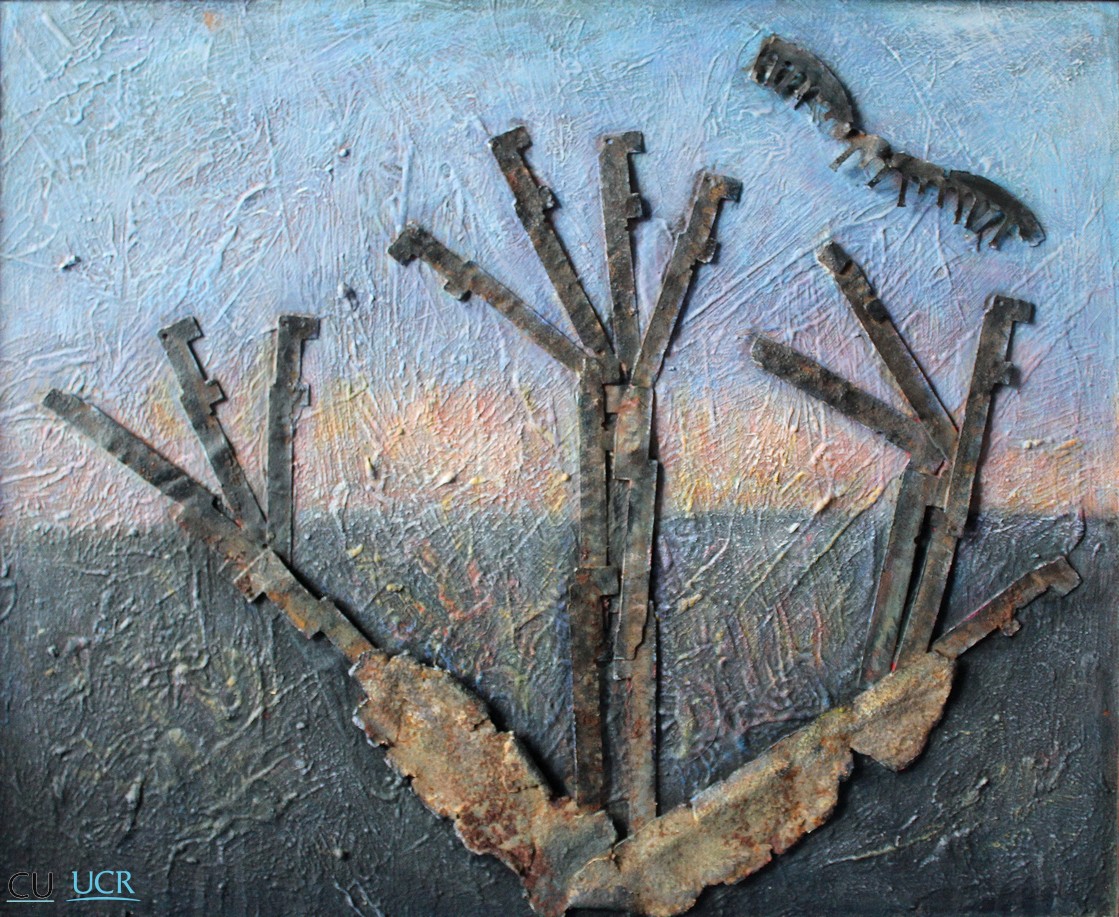 Imagino a Zulay Soto caminando por la vida, en sus calles habitadas por infinidad de objetos, diferentes materias e imágenes que luego pintan su pensar y su sentir. Ella camina mirando hacia el suelo, al lado o al frente, buscando el objeto-basura, el objeto que ella resignifica y deconstruye en sus diversos collages. Cualquier “lata” pisada por cualquier transeúnte o por los autos, cualquier hierro retorcido, cualquier objeto que sirvió para un algo y que hoy está olvidado o tirado, Zulay Soto lo convierte en arte.