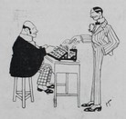 | dc.description | Un hombre sentado en un taburete, escribiendo en una máquina de escribir, que está sobre un escritorio, mientras otro hombre vestido de traje de rayas está de pie frente al otro hombre y de la máquina de escribir, está agarrando la hoja que va saliendo de la máquina de escribir. | |