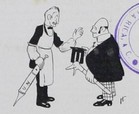 | dc.description | Un hombre con traje de esmoquin, y un delantal largo hasta las rodillas, tiene un objeto como un lapicero muy grande en una mano y la otra mano está aparentemente saludando a otro hombre. El otro hombre tiene un traje formal con pantalones de cuadros, sostiene en una mano un bastón con la cabeza de la forma de cabeza de pato y con el pico abierto, en la otra mano está sosteniendo un sombrero. | |