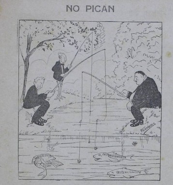 | dc.description | Tres hombres con traje de gala, uno de ellos con pies de ave, se encuentran pescando en un río, se puede visualizar tres pescados. Además, se encuentran en un bosque. | |