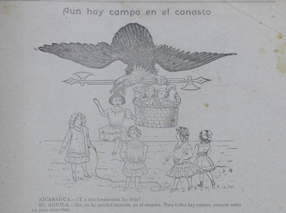 | dc.description | Cuatro niñas, sobre su ropa el nombre de países centroamericanos, están saltando la cuerda, en otro plano un águila gigante toma a una de ellas, y en una de sus garras una canasta con niñas. El ave, tiene sus alas extendidas. | |