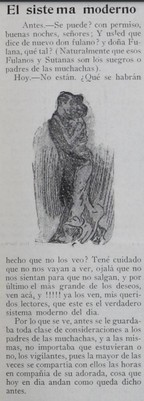 | dc.description | Critican las relaciones más modernas, ya no hay respeto hacia los padres y las muchachas de parte de los novios. Aparece una pareja besándose y muy románticos. | |