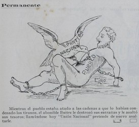 | dc.description | Aparece un hombre encadenado al suelo, desnudo, que representa al pueblo, sobre él un buitre comiendo su piel y carne, el buitre representa un partido político. | |