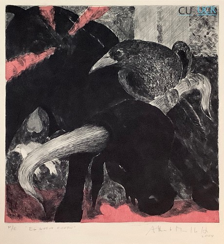 | edm.currentLocation | Composición que sugieren dominio del cuervo negro sobre la paloma de la paz caída. El cuervo está posado sobre el cuerno de un toro long horn tejano | |