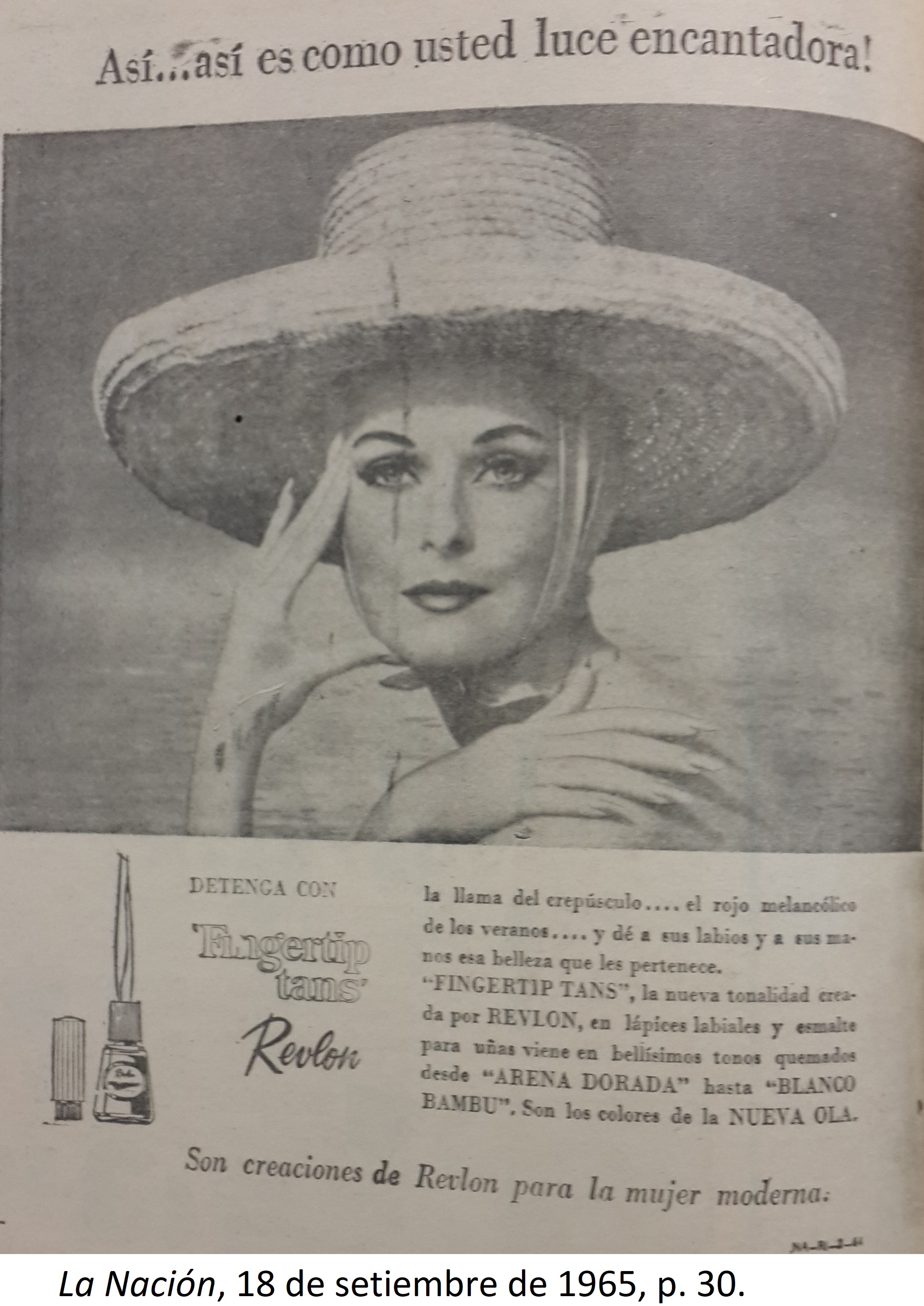 | dc.description | El anuncio muestra en su parte superior una mujer con un sombrero y un hermoso maquillaje. Debajo, se muestra un texto explicativo acerca de las cualidades del labial de la marca Revlon y a la izquierda la imagen del labial. | |