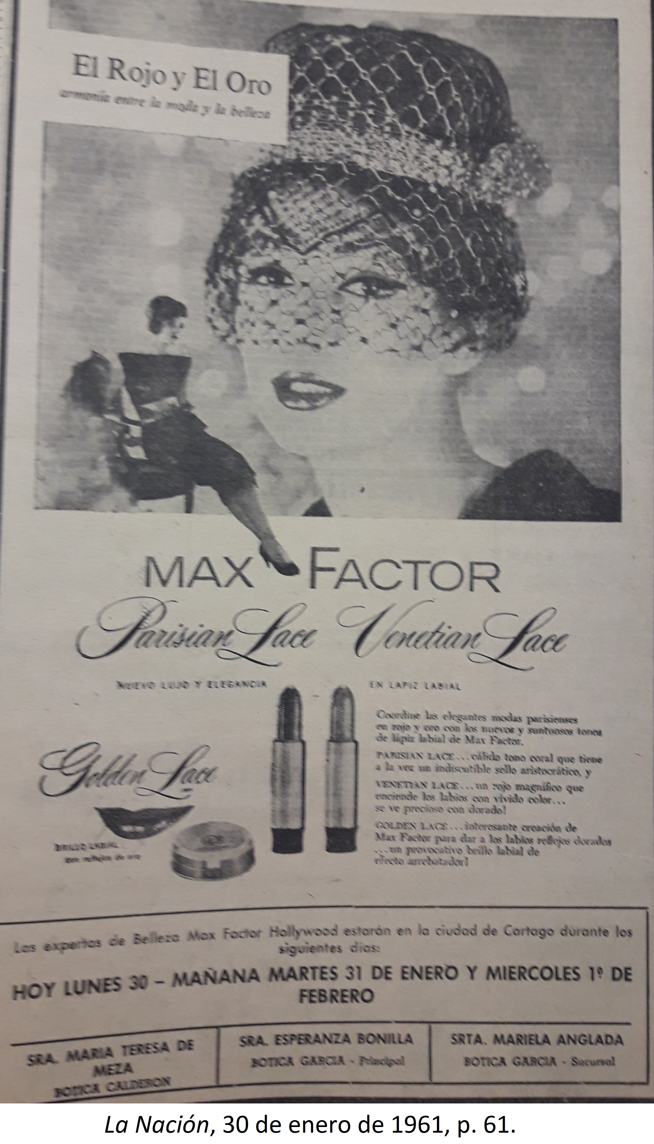 | dc.description | El anuncio muestra en su parte superior una imagen de una mujer con un vestido elegante y una imagen de su rostro de cerca con un bonito maquillaje y un sombrero. Debajo se presenta un texto explicativo acerca de las propiedades del labial Max factor y una imagen de dos labiales. Al final de anuncio se presenta un texto con la invitación a un evento en Cartago donde se encontrarán expertas en maquillaje. | |