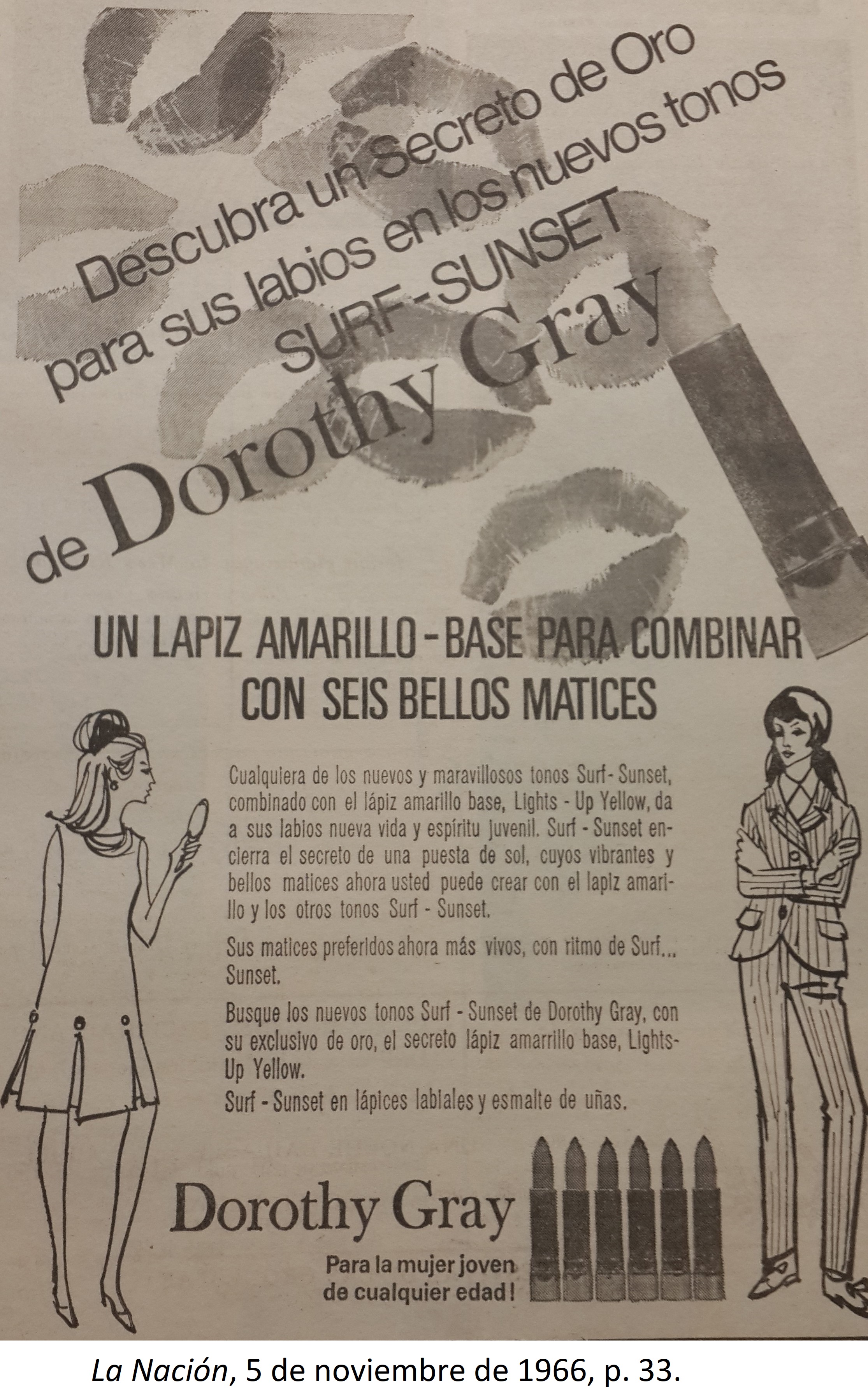 | dc.description | El anuncio muestra en su parte superior un texto acerca de las propiedades del labial Surf-Sunset. Debajo de este se muestra un texto explicativo acerca de las cualidades del del labial de la marca Dorothy Gray. A los lados del texto, se presenta la imagen de dos mujeres, una con un vestido formal y la otra con un conjunto de saco formal. Finalmente se presente seis imágenes de los labiales. | |