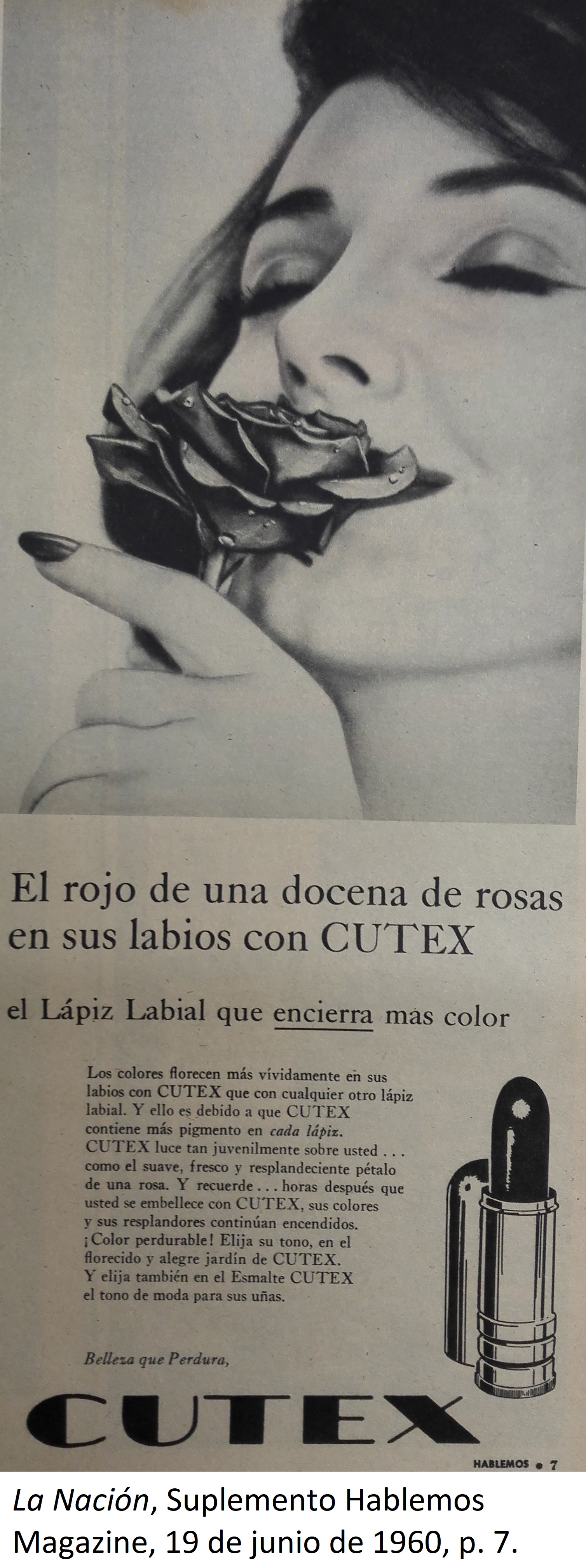 | dc.description | El anuncio muestra en su parte superior a una mujer con una rosa en las manos, oliendo su aroma. Debajo aparece un texto explicativo acerca de las cualidades del labial de la marca Cutex y finalmente una imagen del labial. | |