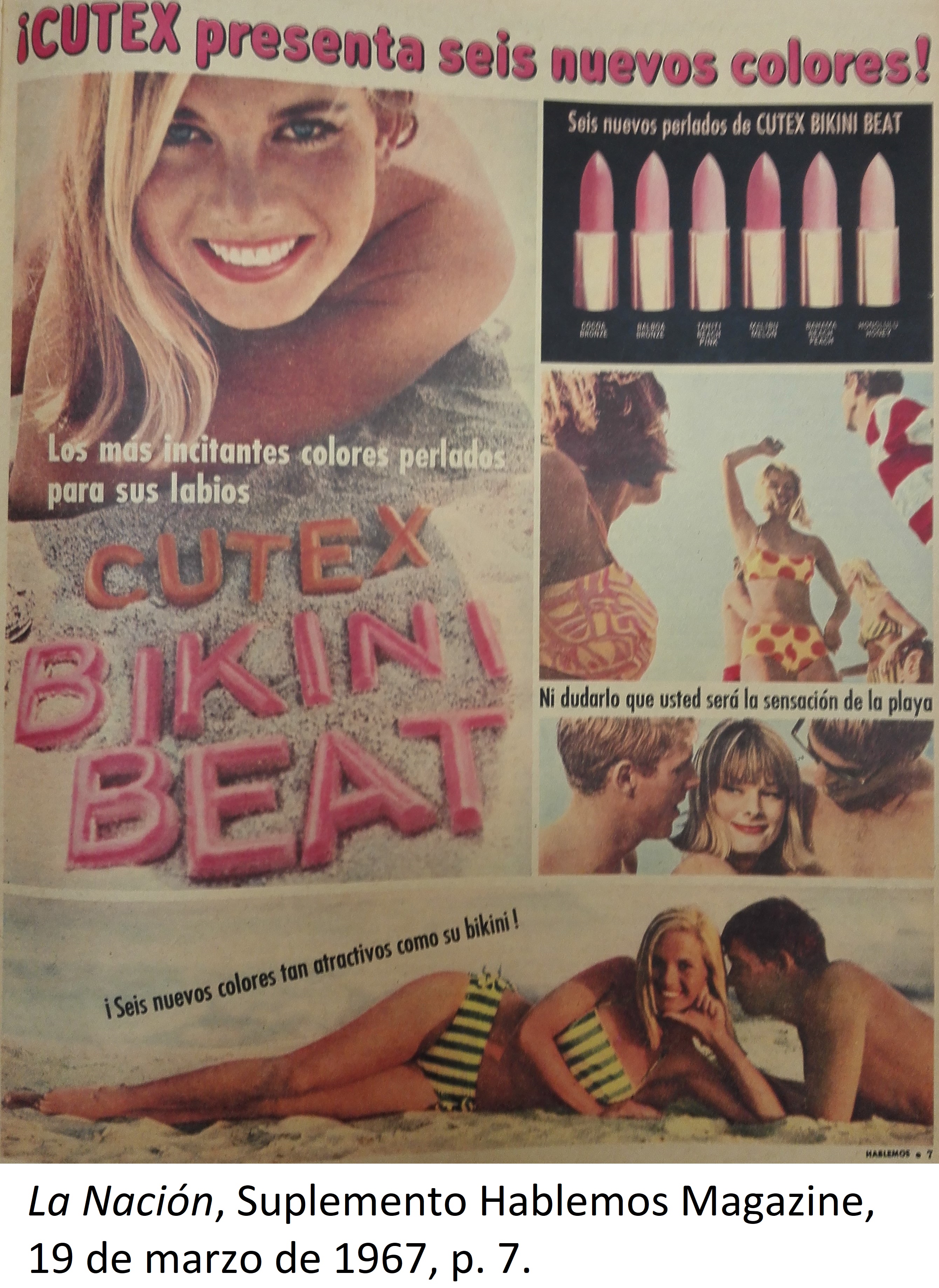 | dc.description | En la parte izquierda del anuncio se muestra a una mujer acostada enseñando sus labios pintados, en la parte superior derecha aparecen 6 labiales de la marca Cutex en diferentes tonos de rosado, abajo, se muestra un grupo de personas disfrutando, debajo de ellos una mujer entre dos hombres. Finalmente, en la zona de abajo se muestra una mujer y un hombre acostados en la playa. | |