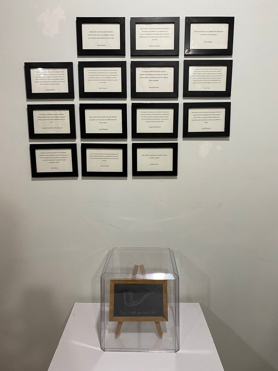 | dc.description | 14 marcos fotográficos que contienen citas de autores y autoras diversos, con una pieza escultórica en frente. instalación, obra visual, bidimensional, tridimensional | |