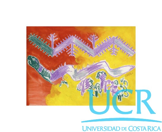| dc.description | Pintura de una serpiente en colores turquesa y morado, acompañada de un elemento en zigzag sobre esta y con los mismos colores. Ambas figuras están sobrepuestas sobre un fondo amarillo y rojo y acompañadas por elementos que asemejan árboles. | |