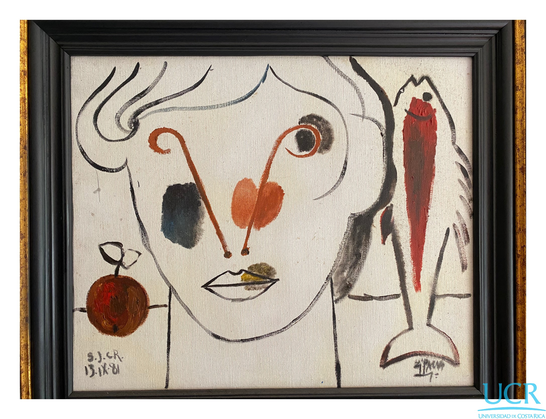 | dc.description | Pintura representando un rostro de un adolescente con manchones de colores azul y naranja, un pescado con un manchón rojo y una fruta en tonos cafés. Todas las figuras delineadas con un tono negro, sobre un fondo blanco. | |