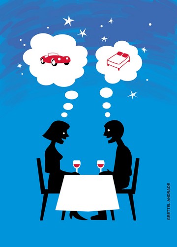 | dc.description | Cartel vertical con fondo de color azul. No presenta texto. Sin embargo, abajo se aprecia la imagen de dos siluetas negras de una pareja sentada en una mesa teniendo una cita y están tomando vino. Arriba se encuentra unos globos de imaginacion para cada uno y ella imagina una auto deportivo y él imagina una cama. | |