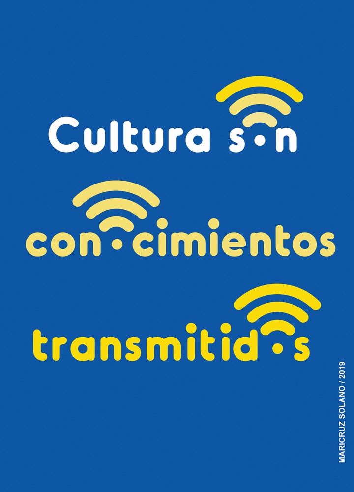 | dc.description | Cartel vertical con fondo de color azul, Contiene de texto: "Cultura son conocimientos transmitidos". Y de imagen sería símbolos de wifi en las letras "O' de cada palabra. | |