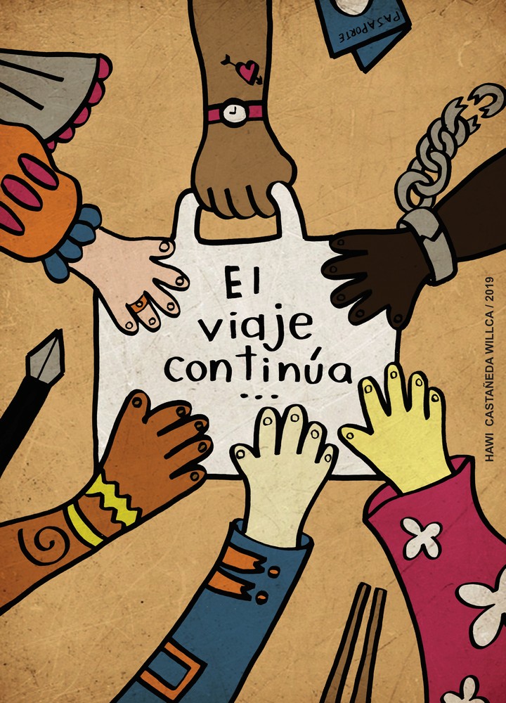| dc.description | Cartel vertical con fondo de color café. Contiene de texto: "El viaje continúa". Y de imagen sería de manos de diferentes etnias, épocas e historias que tocan una maleta. La mano de arriba sujeta la maleta junto con un pasaporte. | |
