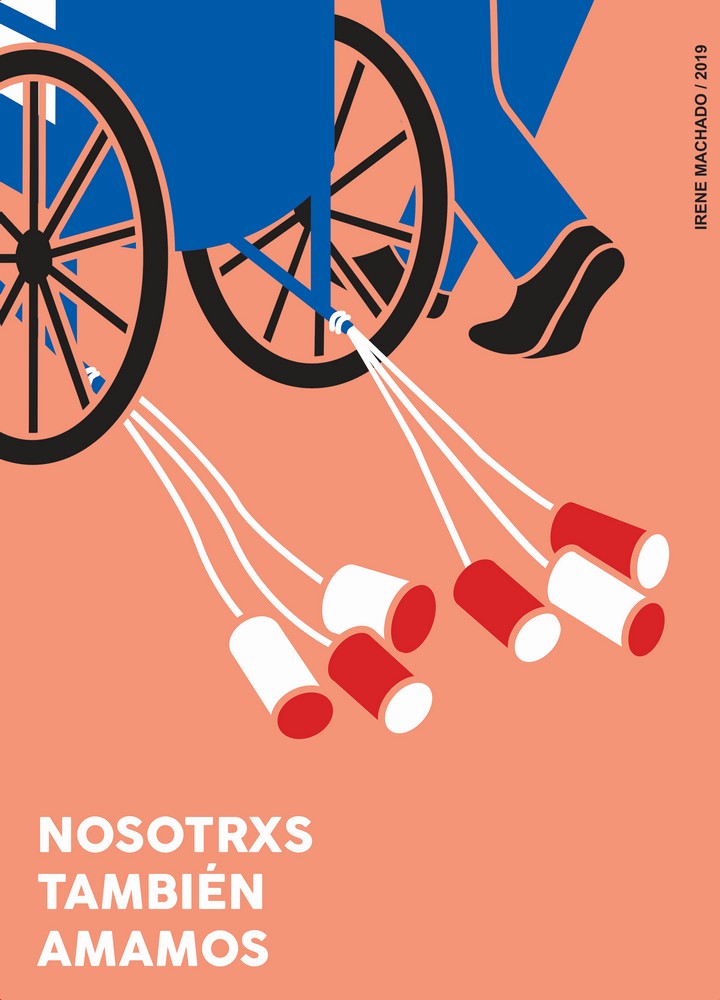 | dc.description | Cartel vertical con fondo de color rosa (forma parte de un tríptico). De texto dice: "Nosotrxs también amamos". De imagen se encuentra una pareja de personas y una en silla de ruedas. | |