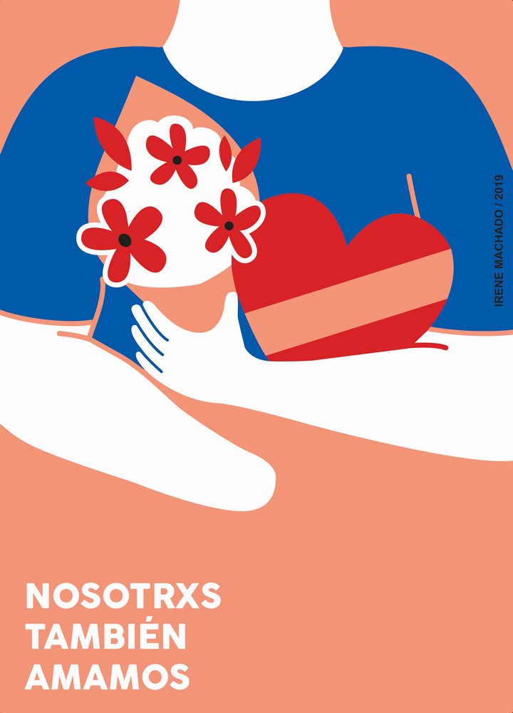 | dc.description | Cartel vertical con fondo de color rosa (forma parte de un tríptico que lo une con los otros carteles de la autora), de texto dice: "Nosotrxs también amamos". Imagen de una persona con flores y chocolates, a la que le falta una mano. | |