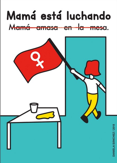 | dc.description | Cartel vertical con fondo de color blanco arriba y de color turquesa abajo. Está el texto de la parte de arriba que dice: "Mamá está luchando". Y hay otro debajo que dice: "Mamá amasa en la mesa" y este se encuentra tachado. Como imagen está una mujer que sale de la casa con una bandera roja que tiene el símbolo de la mujer. | |