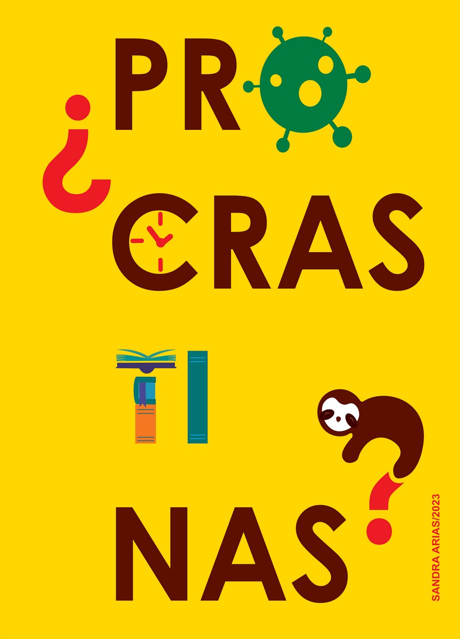 | dc.description | Cartel vertical con fondo de color amarillo. Y de texto dice: "¿Procastinas?". Como imagen aparece el virus del COVID, un reloj, libros y un perezoso en diferentes partes de la tipografía. | |
