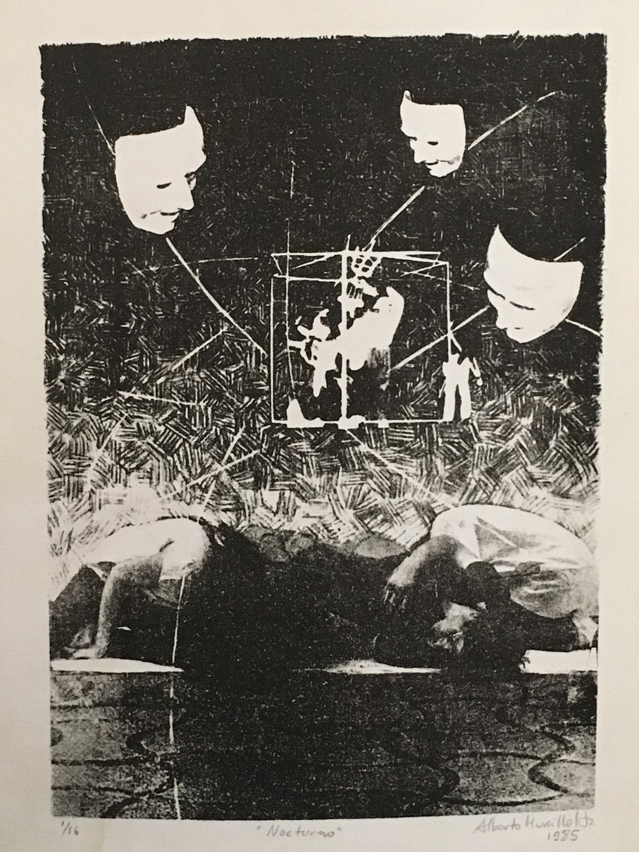 | dc.description | Obra en escala de grises con un paisaje con máscaras flotantes. | |