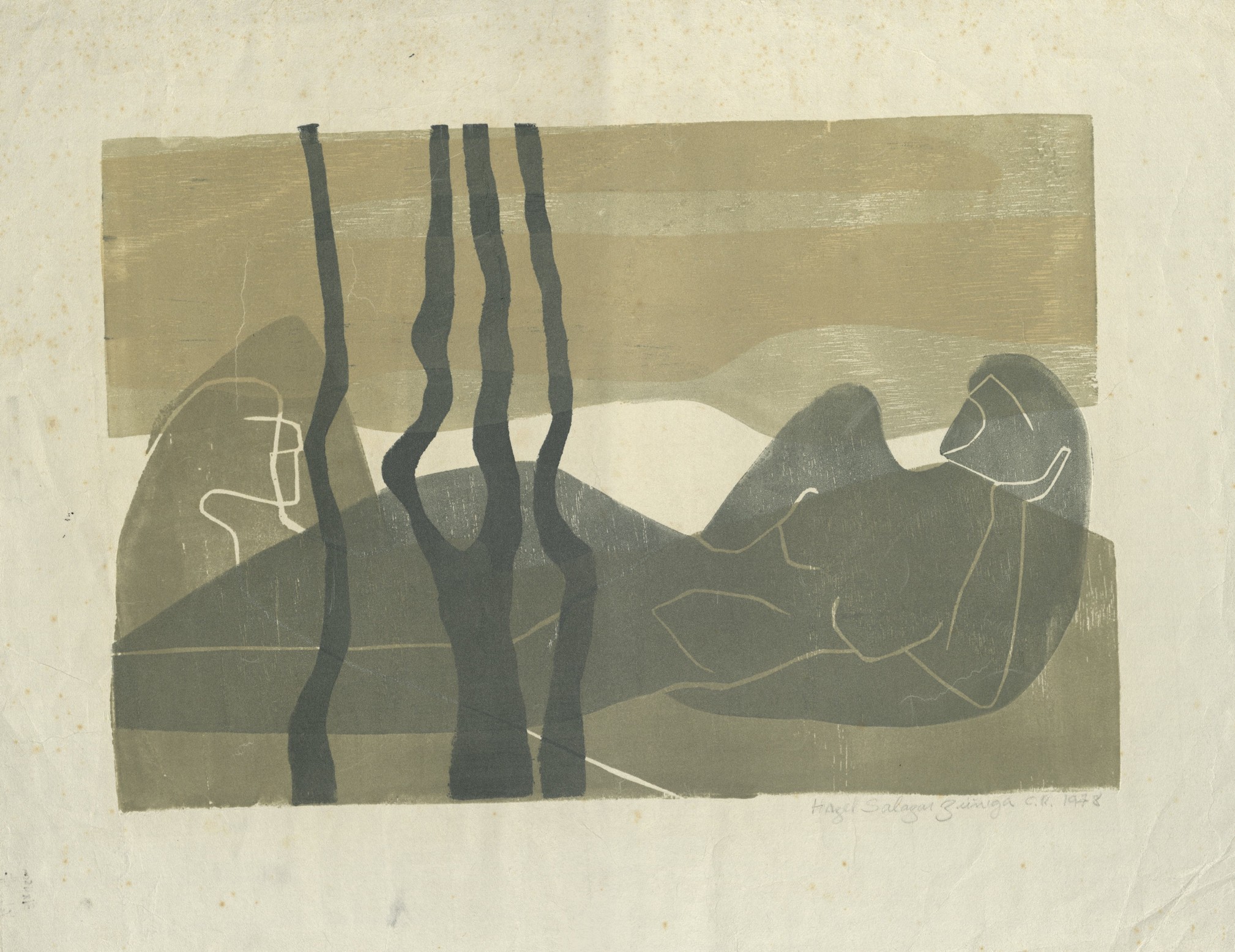 | dc.description | Obra de un paisaje con una silueta de mujer acostada y sujetando su cabeza con el brazo. | |
