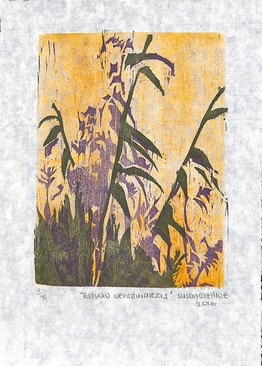 | dc.description | La obra con fondo de color naranja consiste en la muestra de unas plantas de color verde y morado. | |