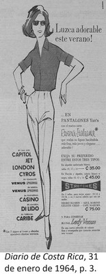 | dc.description | El anuncio se centra en la imagen de una mujer de cuerpo entero que luce ropa de verano, incluidos sus pantalones. A ambos lados de esta imagen se coloca texto. En la parte izquierda se presenta una lista de los locales comerciales en los que se pueden adquirir los pantalones, mientras que en la parte derecha, se destacan las características de esta prenda de vestir. | |