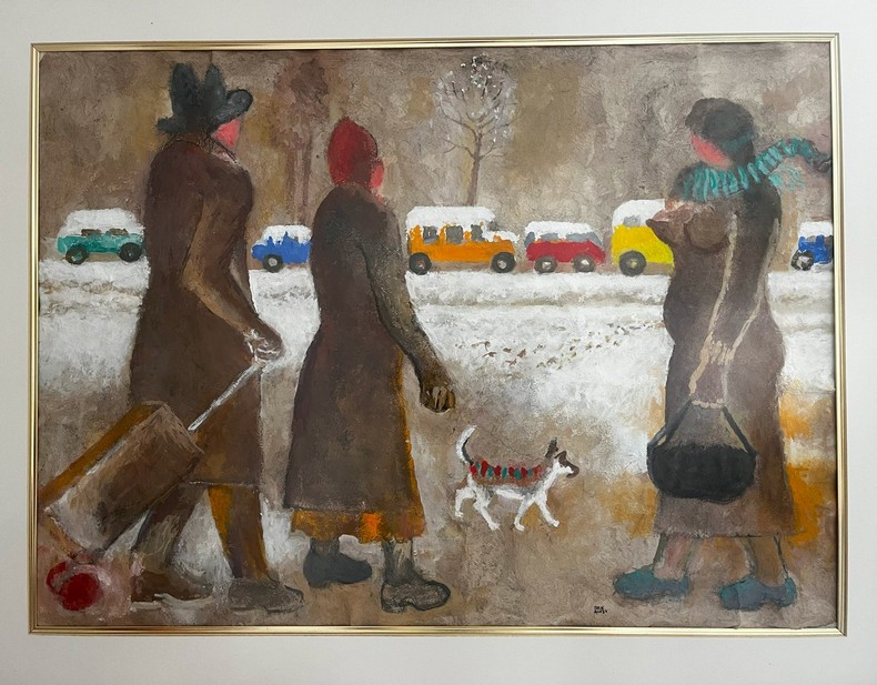 | dc.description | Obra representando a tres figuras humanas, con un perro entre ellas y una serie de carros de colores en el fondo. | |