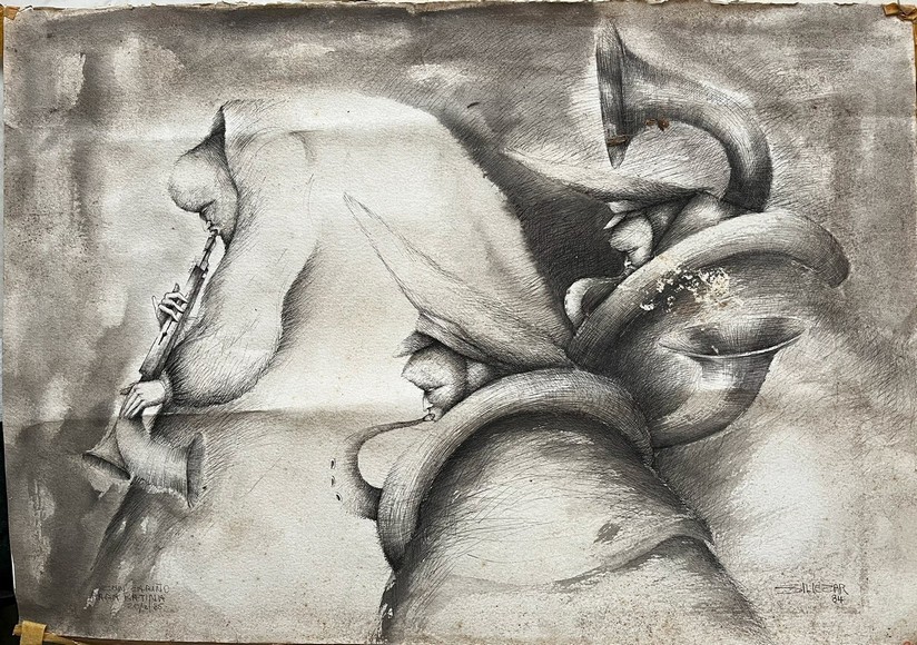 | dc.description | Obra representando tres figuras masculinas tocando diversos instrumentos de aire. | |