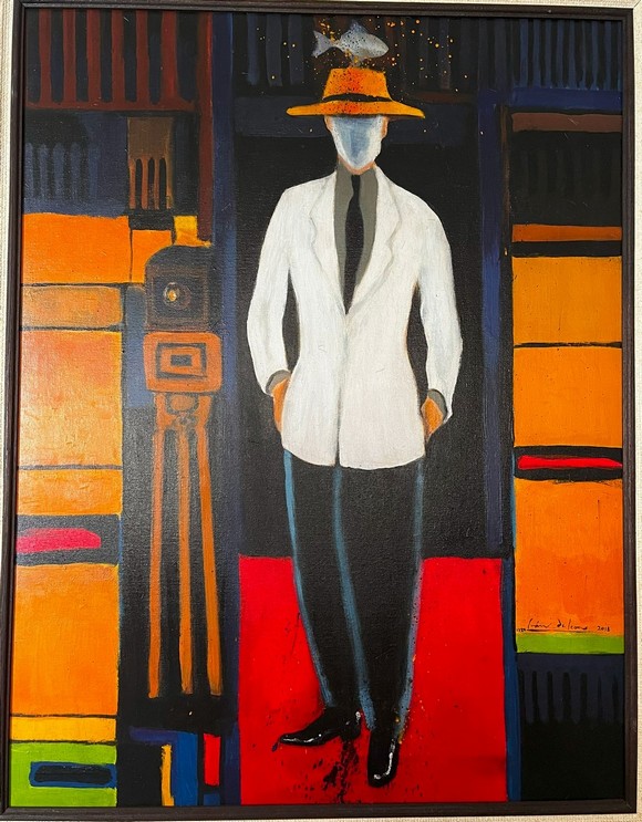 | dc.description | Obra representando a una figura masculina sin rostro, esta se encuentra de pie al lado de una cámara, utiliza un sombrero y sobre su cabeza se observa un pescado. La figura esta sobre un fondo de figuras rectangulares de colores. | |