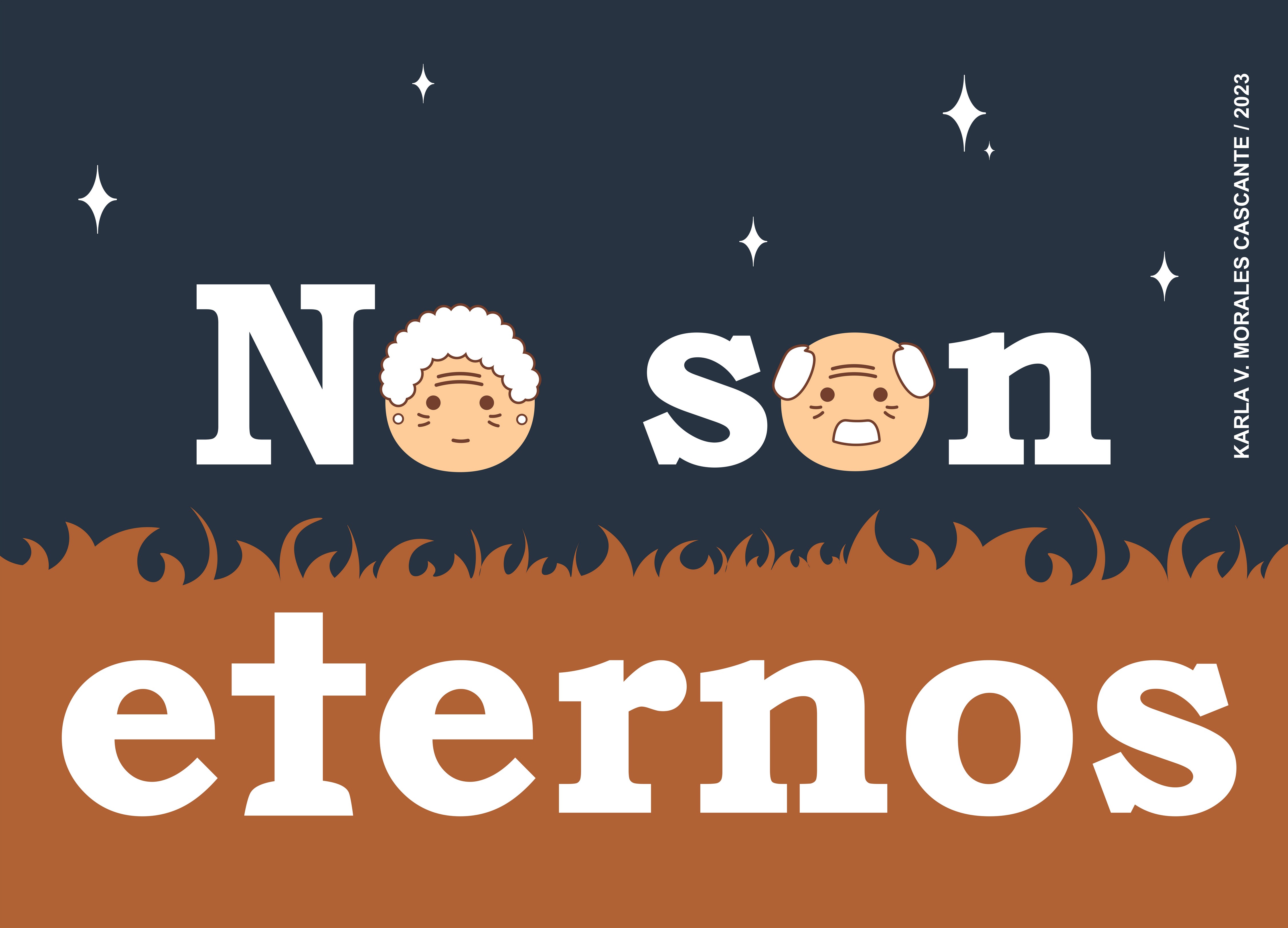 | dc.description | Cartel horizontal y en el fondo se encuentra un paisaje nocturno. Arriba el cielo azul estrellado y abajo zacate café. Como texto dice: "No son eternos". Además, de imagen se muestra una cabeza de abuelito y abuelita en las "o" del texto "no son". Y en la "T" de eternos una cruz de una tumba. | |