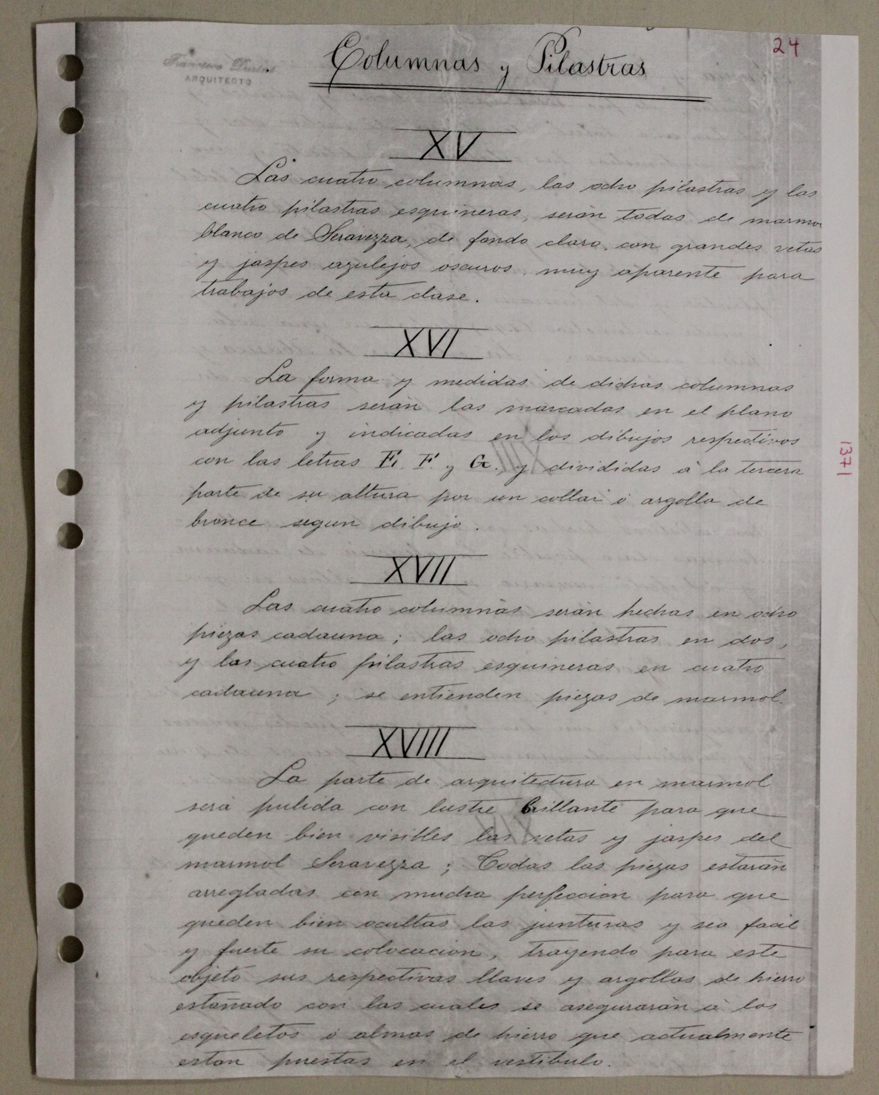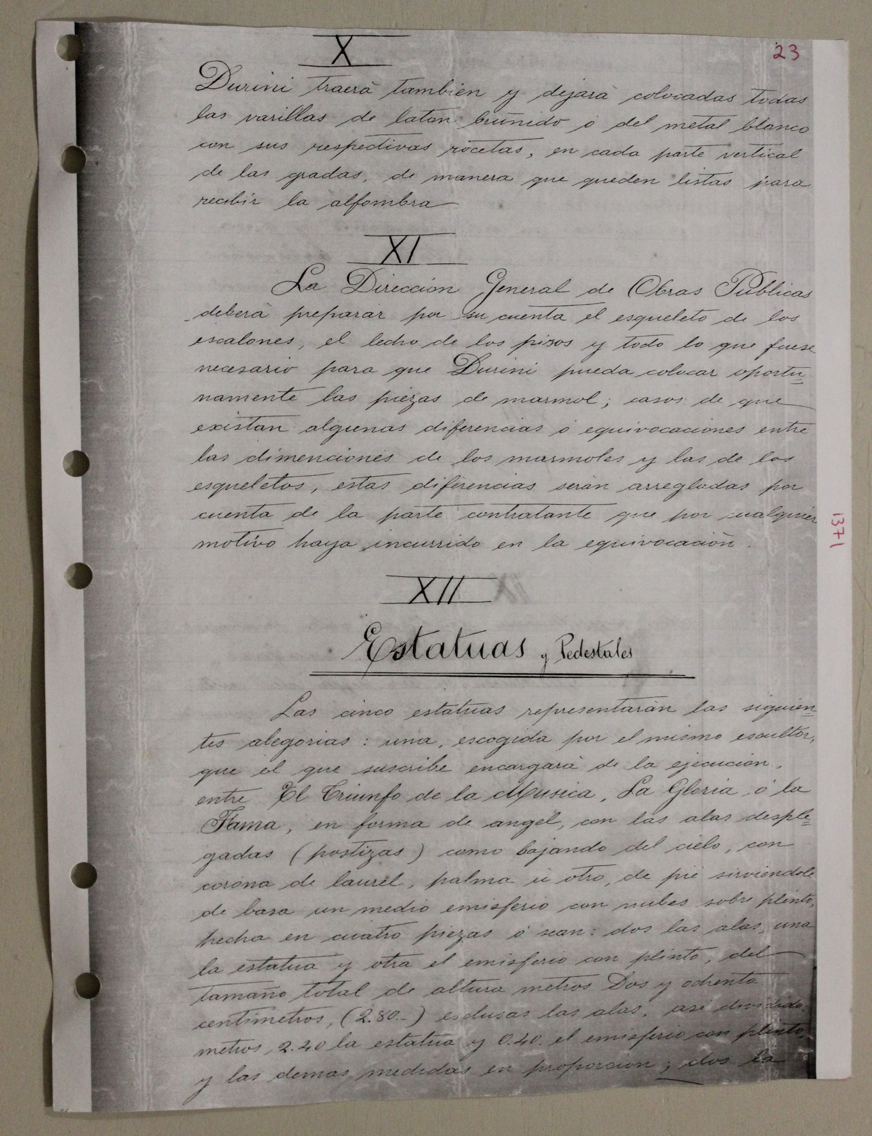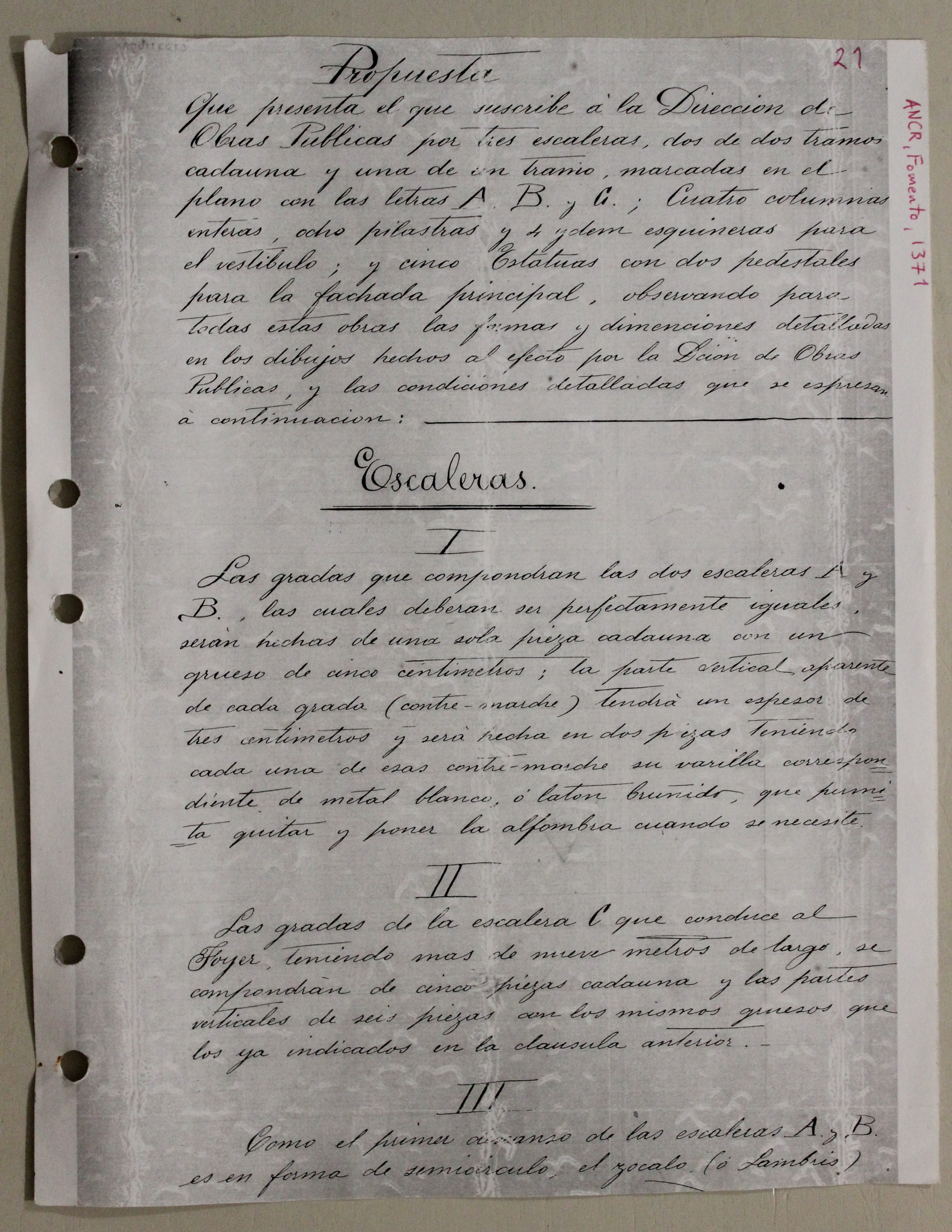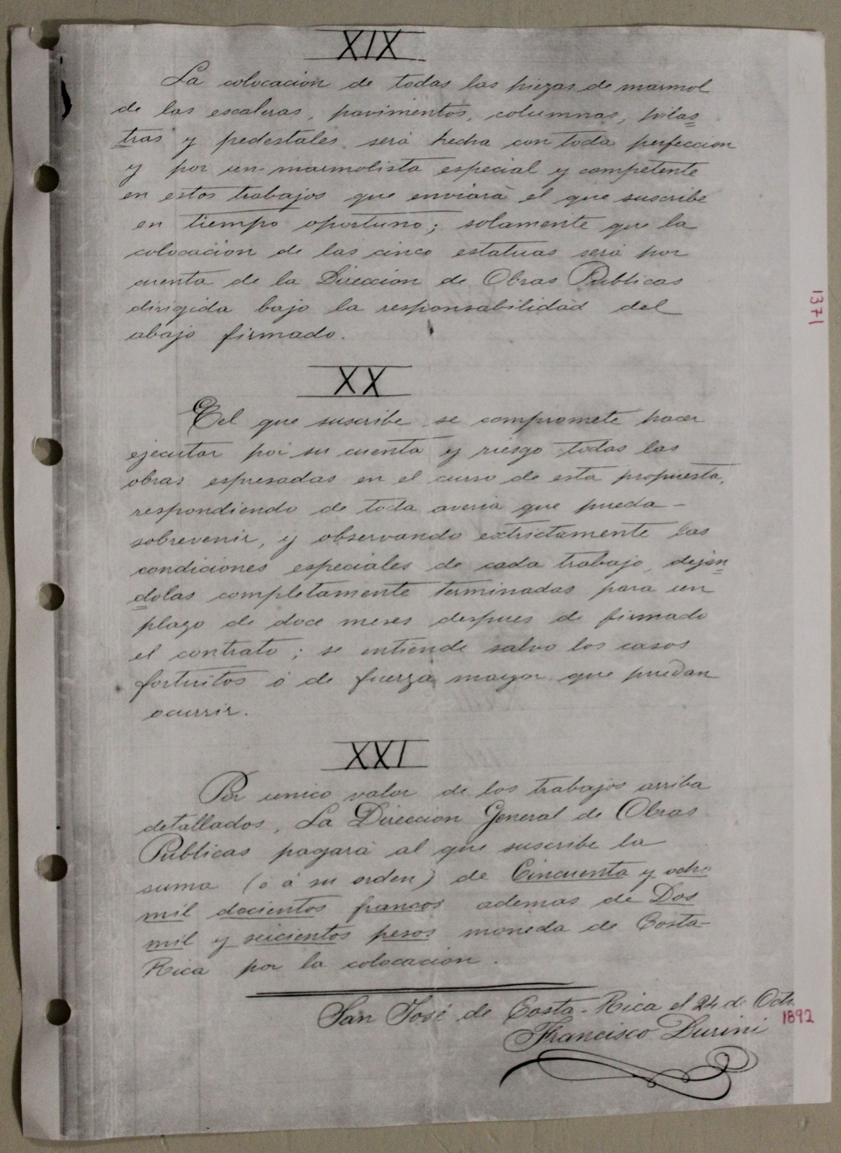 | dc.description | Propuesta redactada por Francisco Durini en 1892 y dirigida a la Dirección de Obras Públicas. En esta se detallan las condiciones a cumplirse para ejecutar tres escaleras, cuatro columnas enteras, ocho pilastras y cuatro pilastras esquineras para el vestíbulo; así como cinco estatuas con dos pedestales para la fachada principal del Teatro Nacional de Costa Rica. | |