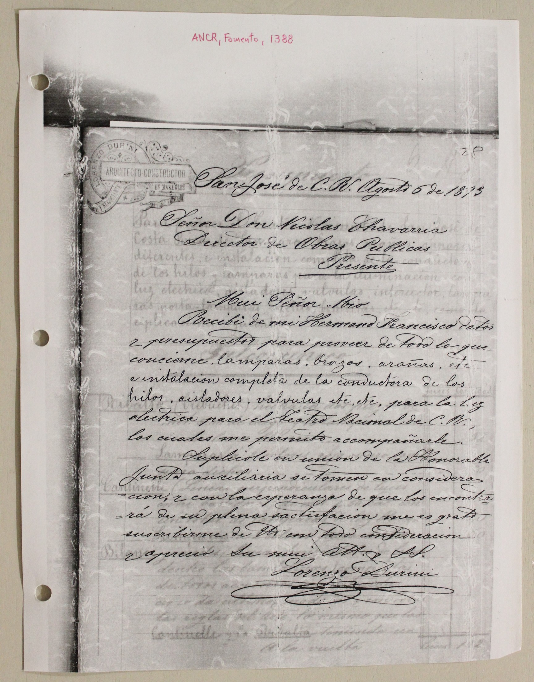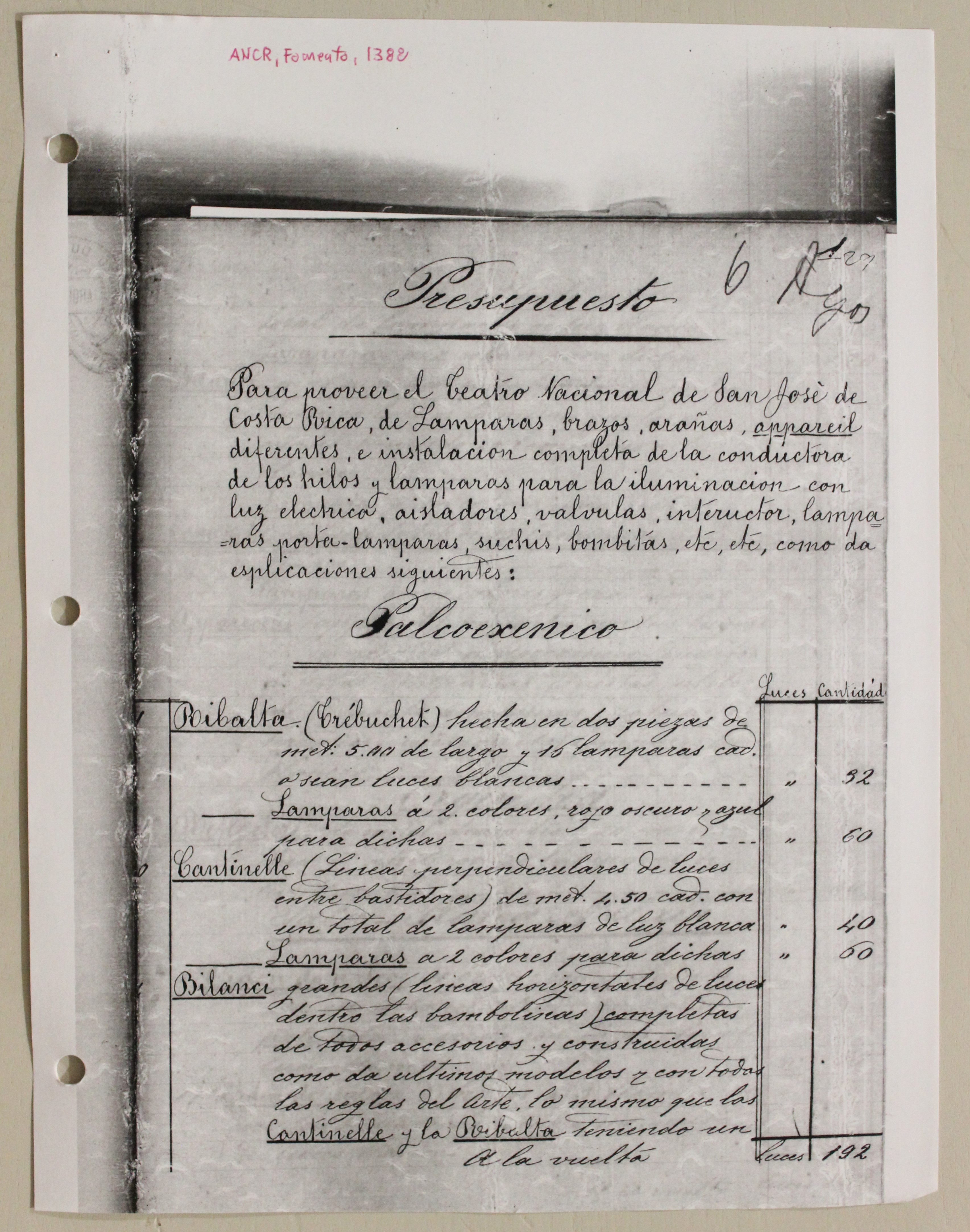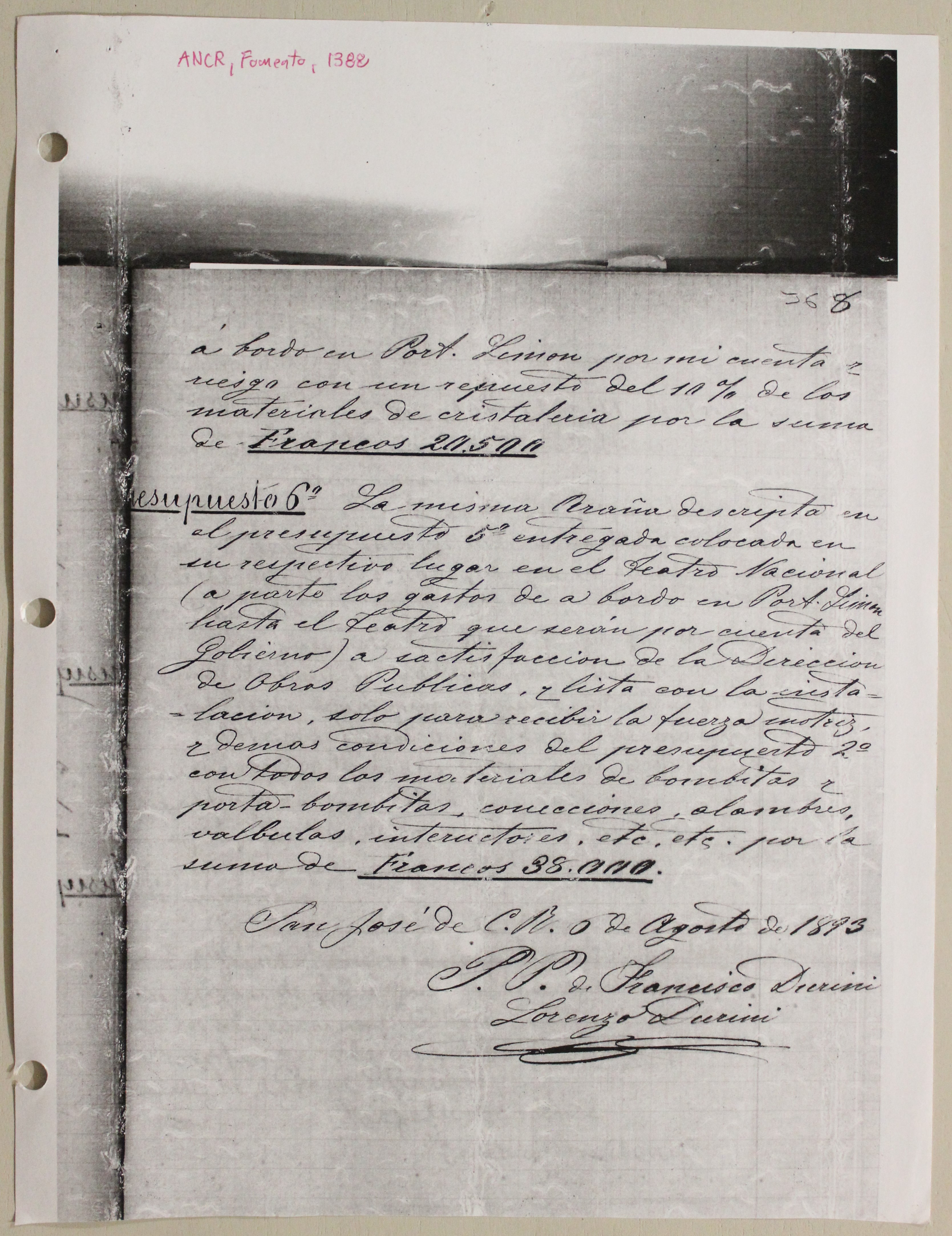 | dc.description | Fotografía de fotocopia de carta redactada por Lorenzo Durini en 1893 y dirigida al Señor Nicolás Chavarría, director de Obras Públicas. En esta Durini detalla el presupuesto y los componentes necesarios para proveer al Teatro Nacional de Costa Rica con lámparas, brazos, arañas, appareil diferentes e instalación completa de la conductora de los hilos y lámparas para la iluminación con luz eléctrica, aisladores, válvulas, inteructor, lámparas porta-lámparas, suchis, bombitas, entre otros, primera parte. Fotografía de fotocopia de carta redactada por Lorenzo Durini en 1893 y dirigida al Señor Nicolás Chavarría, director de Obras Públicas. En esta Durini detalla el presupuesto y los componentes necesarios para proveer al Teatro Nacional de Costa Rica con lámparas, brazos, arañas, appareil diferentes e instalación completa de la conductora de los hilos y lámparas para la iluminación con luz eléctrica, aisladores, válvulas, inteructor, lámparas porta-lámparas, suchis, bombitas, entre otros, segunda parte. Fotografía de fotocopia de carta redactada por Lorenzo Durini en 1893 y dirigida al Señor Nicolás Chavarría, director de Obras Públicas. En esta Durini detalla el presupuesto y los componentes necesarios para proveer al Teatro Nacional de Costa Rica con lámparas, brazos, arañas, appareil diferentes e instalación completa de la conductora de los hilos y lámparas para la iluminación con luz eléctrica, aisladores, válvulas, inteructor, lámparas porta-lámparas, suchis, bombitas, entre otros, tercera parte. Fotografía de fotocopia de carta redactada por Lorenzo Durini en 1893 y dirigida al Señor Nicolás Chavarría, director de Obras Públicas. En esta Durini detalla el presupuesto y los componentes necesarios para proveer al Teatro Nacional de Costa Rica con lámparas, brazos, arañas, appareil diferentes e instalación completa de la conductora de los hilos y lámparas para la iluminación con luz eléctrica, aisladores, válvulas, inteructor, lámparas porta-lámparas, suchis, bombitas, entre otros, cuarta parte. Fotografía de fotocopia de carta redactada por Lorenzo Durini en 1893 y dirigida al Señor Nicolás Chavarría, director de Obras Públicas. En esta Durini detalla el presupuesto y los componentes necesarios para proveer al Teatro Nacional de Costa Rica con lámparas, brazos, arañas, appareil diferentes e instalación completa de la conductora de los hilos y lámparas para la iluminación con luz eléctrica, aisladores, válvulas, inteructor, lámparas porta-lámparas, suchis, bombitas, entre otros, quinta parte. Fotografía de fotocopia de carta redactada por Lorenzo Durini en 1893 y dirigida al Señor Nicolás Chavarría, director de Obras Públicas. En esta Durini detalla el presupuesto y los componentes necesarios para proveer al Teatro Nacional de Costa Rica con lámparas, brazos, arañas, appareil diferentes e instalación completa de la conductora de los hilos y lámparas para la iluminación con luz eléctrica, aisladores, válvulas, inteructor, lámparas porta-lámparas, suchis, bombitas, entre otros, sexta parte. Fotografía de fotocopia de carta redactada por Lorenzo Durini en 1893 y dirigida al Señor Nicolás Chavarría, director de Obras Públicas. En esta Durini detalla el presupuesto y los componentes necesarios para proveer al Teatro Nacional de Costa Rica con lámparas, brazos, arañas, appareil diferentes e instalación completa de la conductora de los hilos y lámparas para la iluminación con luz eléctrica, aisladores, válvulas, inteructor, lámparas porta-lámparas, suchis, bombitas, entre otros, séptima parte. Fotografía de fotocopia de carta redactada por Lorenzo Durini en 1893 y dirigida al Señor Nicolás Chavarría, director de Obras Públicas. En esta Durini detalla el presupuesto y los componentes necesarios para proveer al Teatro Nacional de Costa Rica con lámparas, brazos, arañas, appareil diferentes e instalación completa de la conductora de los hilos y lámparas para la iluminación con luz eléctrica, aisladores, válvulas, inteructor, lámparas porta-lámparas, suchis, bombitas, entre otros, octava parte. | |