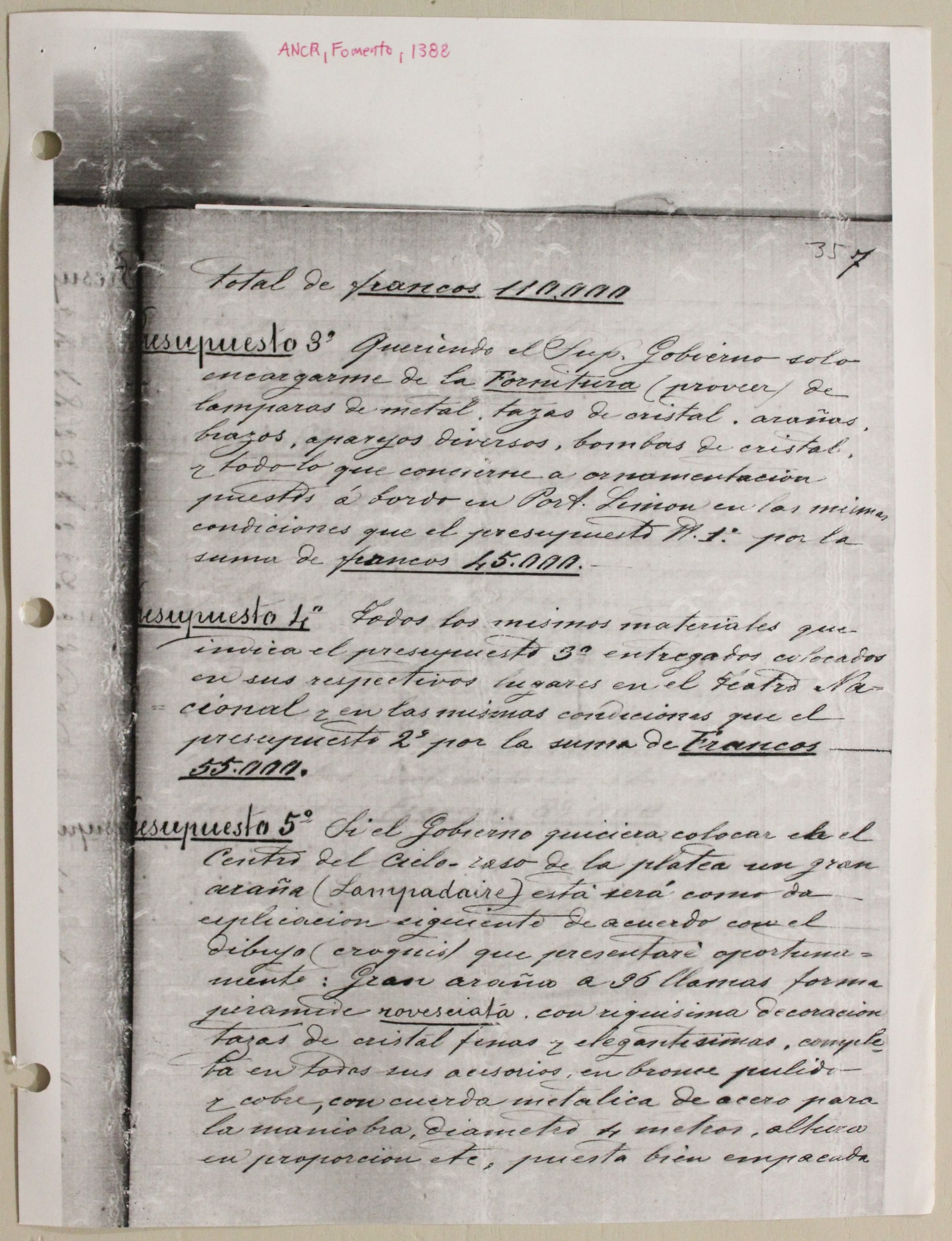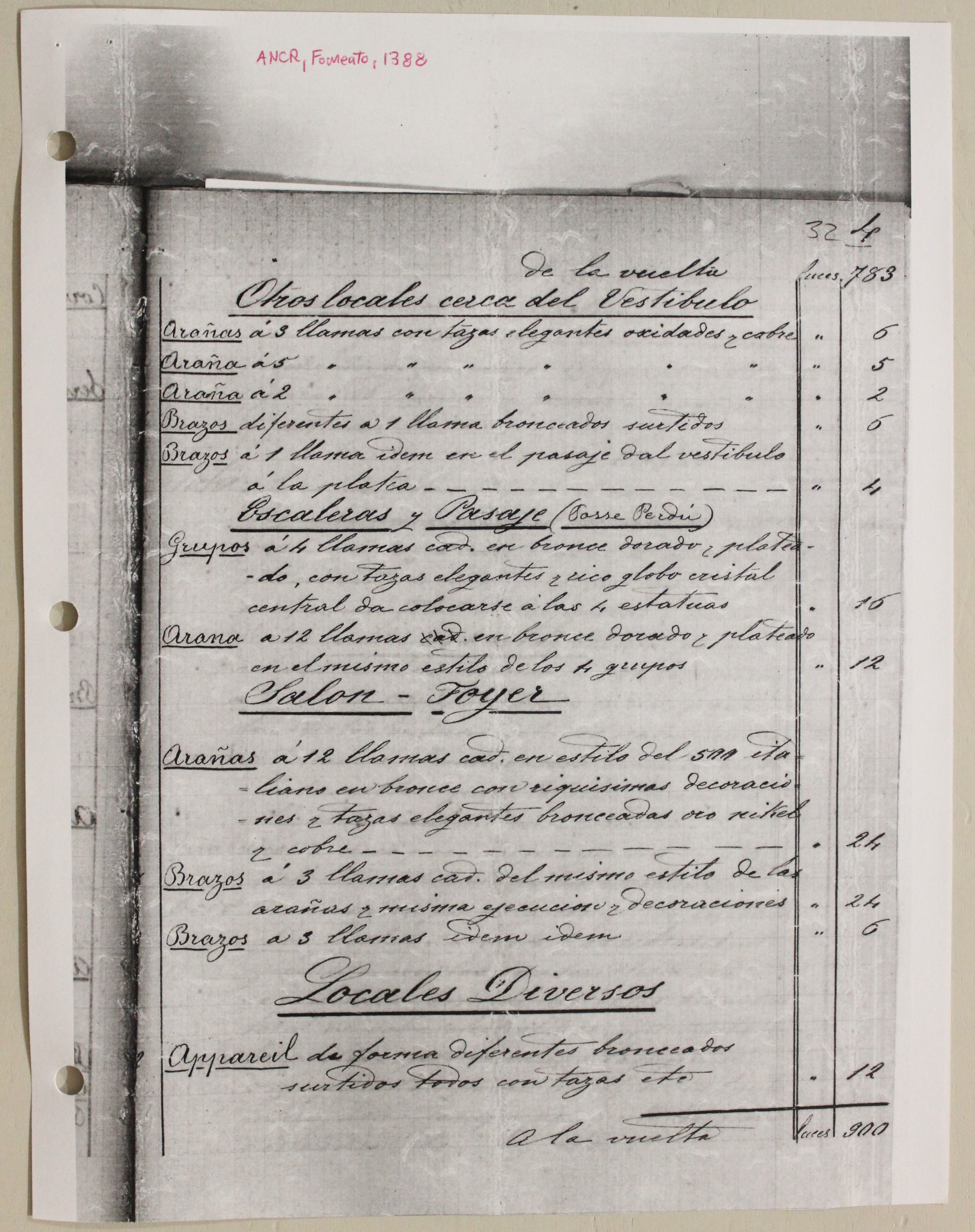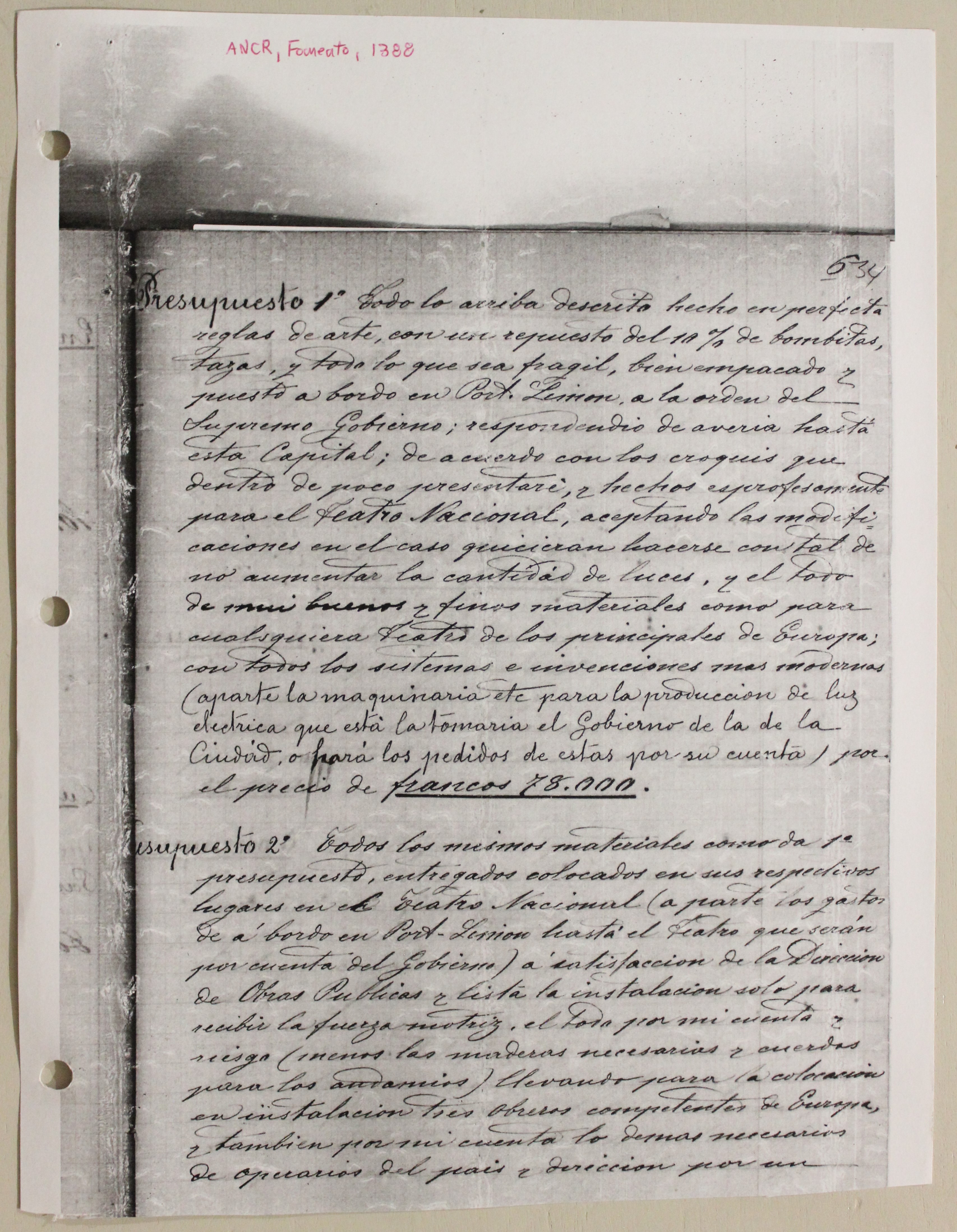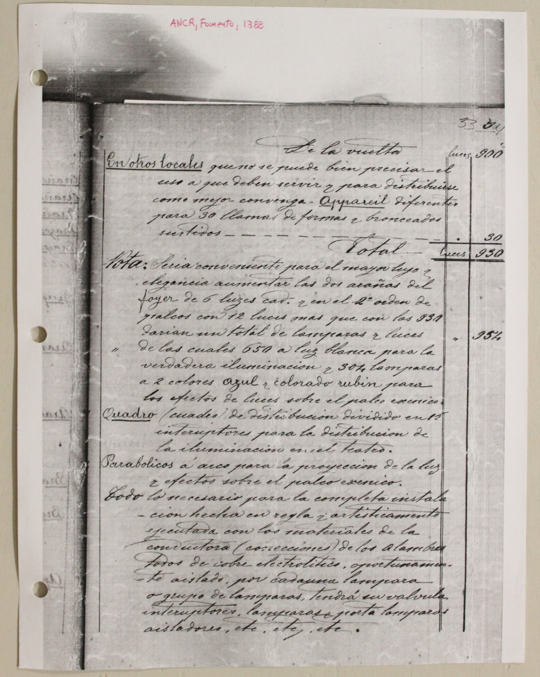 | dc.description | Fotografía de fotocopia de carta redactada por Lorenzo Durini en 1893 y dirigida al Señor Nicolás Chavarría, director de Obras Públicas. En esta Durini detalla el presupuesto y los componentes necesarios para proveer al Teatro Nacional de Costa Rica con lámparas, brazos, arañas, appareil diferentes e instalación completa de la conductora de los hilos y lámparas para la iluminación con luz eléctrica, aisladores, válvulas, inteructor, lámparas porta-lámparas, suchis, bombitas, entre otros, primera parte. Fotografía de fotocopia de carta redactada por Lorenzo Durini en 1893 y dirigida al Señor Nicolás Chavarría, director de Obras Públicas. En esta Durini detalla el presupuesto y los componentes necesarios para proveer al Teatro Nacional de Costa Rica con lámparas, brazos, arañas, appareil diferentes e instalación completa de la conductora de los hilos y lámparas para la iluminación con luz eléctrica, aisladores, válvulas, inteructor, lámparas porta-lámparas, suchis, bombitas, entre otros, segunda parte. Fotografía de fotocopia de carta redactada por Lorenzo Durini en 1893 y dirigida al Señor Nicolás Chavarría, director de Obras Públicas. En esta Durini detalla el presupuesto y los componentes necesarios para proveer al Teatro Nacional de Costa Rica con lámparas, brazos, arañas, appareil diferentes e instalación completa de la conductora de los hilos y lámparas para la iluminación con luz eléctrica, aisladores, válvulas, inteructor, lámparas porta-lámparas, suchis, bombitas, entre otros, tercera parte. Fotografía de fotocopia de carta redactada por Lorenzo Durini en 1893 y dirigida al Señor Nicolás Chavarría, director de Obras Públicas. En esta Durini detalla el presupuesto y los componentes necesarios para proveer al Teatro Nacional de Costa Rica con lámparas, brazos, arañas, appareil diferentes e instalación completa de la conductora de los hilos y lámparas para la iluminación con luz eléctrica, aisladores, válvulas, inteructor, lámparas porta-lámparas, suchis, bombitas, entre otros, cuarta parte. Fotografía de fotocopia de carta redactada por Lorenzo Durini en 1893 y dirigida al Señor Nicolás Chavarría, director de Obras Públicas. En esta Durini detalla el presupuesto y los componentes necesarios para proveer al Teatro Nacional de Costa Rica con lámparas, brazos, arañas, appareil diferentes e instalación completa de la conductora de los hilos y lámparas para la iluminación con luz eléctrica, aisladores, válvulas, inteructor, lámparas porta-lámparas, suchis, bombitas, entre otros, quinta parte. Fotografía de fotocopia de carta redactada por Lorenzo Durini en 1893 y dirigida al Señor Nicolás Chavarría, director de Obras Públicas. En esta Durini detalla el presupuesto y los componentes necesarios para proveer al Teatro Nacional de Costa Rica con lámparas, brazos, arañas, appareil diferentes e instalación completa de la conductora de los hilos y lámparas para la iluminación con luz eléctrica, aisladores, válvulas, inteructor, lámparas porta-lámparas, suchis, bombitas, entre otros, sexta parte. Fotografía de fotocopia de carta redactada por Lorenzo Durini en 1893 y dirigida al Señor Nicolás Chavarría, director de Obras Públicas. En esta Durini detalla el presupuesto y los componentes necesarios para proveer al Teatro Nacional de Costa Rica con lámparas, brazos, arañas, appareil diferentes e instalación completa de la conductora de los hilos y lámparas para la iluminación con luz eléctrica, aisladores, válvulas, inteructor, lámparas porta-lámparas, suchis, bombitas, entre otros, séptima parte. Fotografía de fotocopia de carta redactada por Lorenzo Durini en 1893 y dirigida al Señor Nicolás Chavarría, director de Obras Públicas. En esta Durini detalla el presupuesto y los componentes necesarios para proveer al Teatro Nacional de Costa Rica con lámparas, brazos, arañas, appareil diferentes e instalación completa de la conductora de los hilos y lámparas para la iluminación con luz eléctrica, aisladores, válvulas, inteructor, lámparas porta-lámparas, suchis, bombitas, entre otros, octava parte. | |