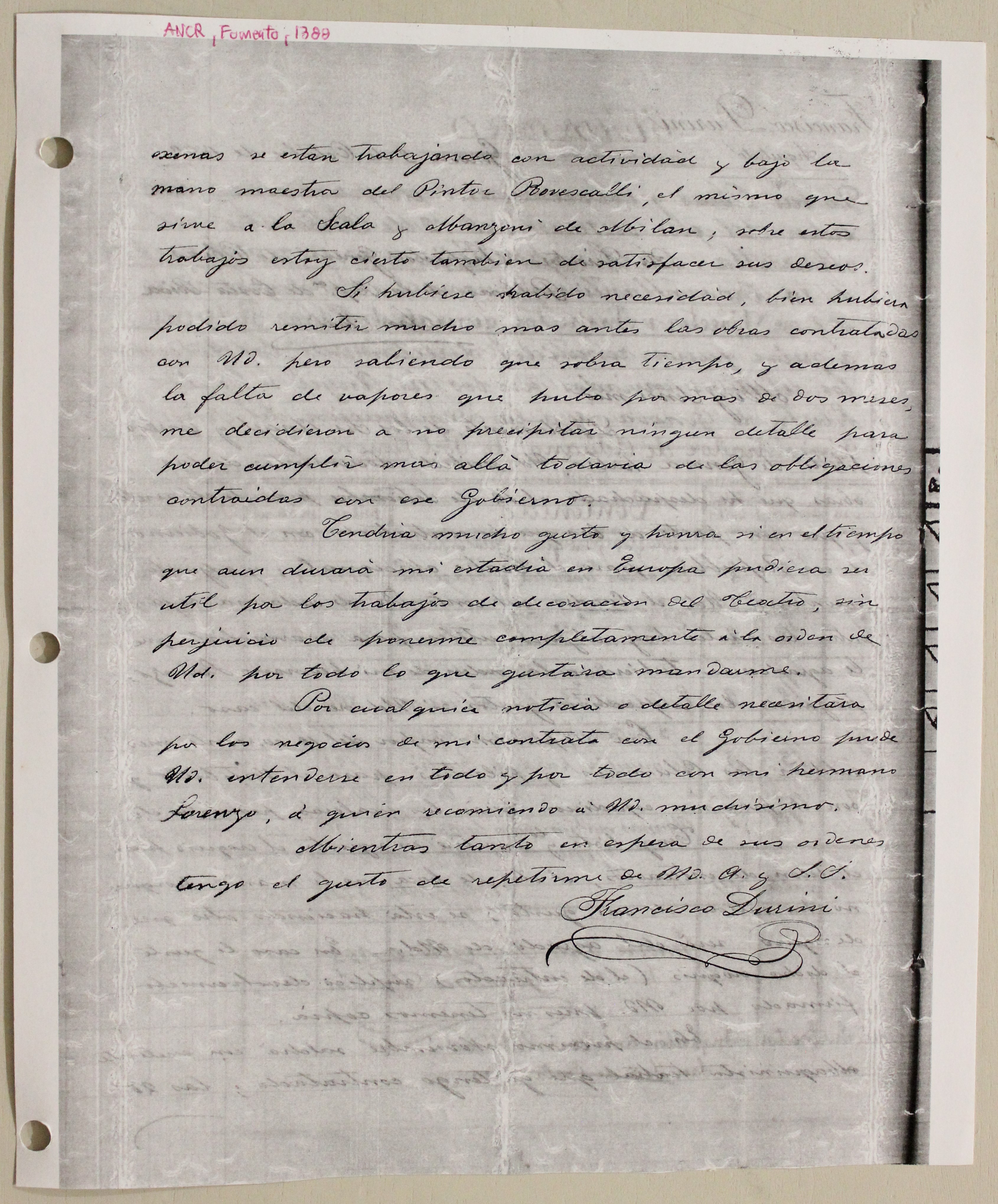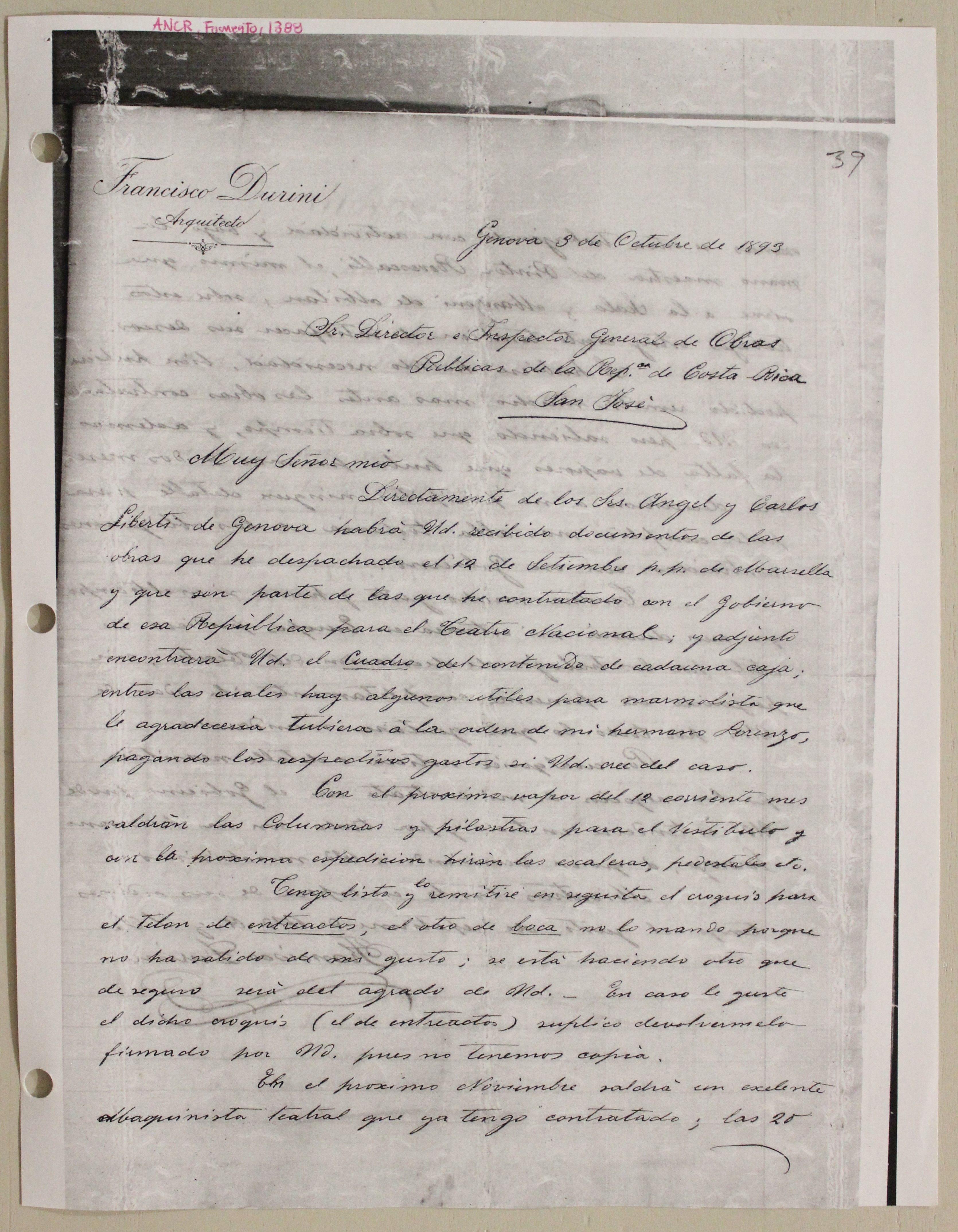 | dc.description | Fotografía de fotocopia de carta redactada por Francisco Durini desde Genova en 1893 y dirigida al Señor Nicolás Chavarría, director de Obras Públicas. En esta Durini comenta algunos adelantos de lo que ha trabajado desde Europa, como el envío de una serie de esculturas, el próximo envío de columnas y pilastras, así como escaleras y pedestales y un croquis para el telón, primera hoja. Fotografía de fotocopia de carta redactada por Francisco Durini desde Genova en 1893 y dirigida al Señor Nicolás Chavarría, director de Obras Públicas. En esta Durini comenta algunos adelantos de lo que ha trabajado desde Europa, como el envío de una serie de esculturas, el próximo envío de columnas y pilastras, así como escaleras y pedestales y un croquis para el telón, segunda hoja. | |